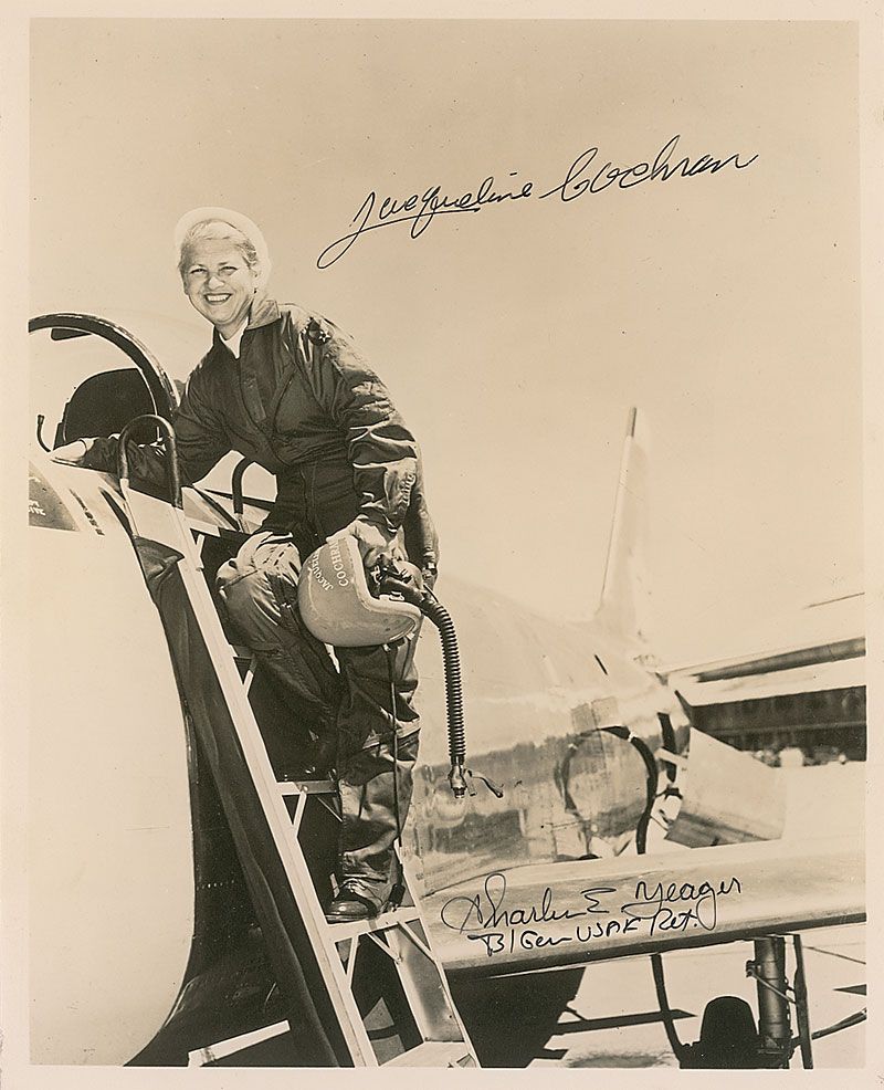 Cochran (1906–1980) was the first female pilot to break the sound barrier and is said to have more aviation records and awards than any pilot in the United States; also a close friend of Chuck Yeager. Matte-finish 7.75 x 9.75 photo of Cochran beside her plane, signed in black felt tip, “Jacqueline Cochran” and also signed by Charles Yeager “Chuck Yeager, B. Gen. USAF Ret.” A noticeable crease to the lower right corner, paperclip impressions to the upper left, and lightly trimmed edges, otherwise fine condition.