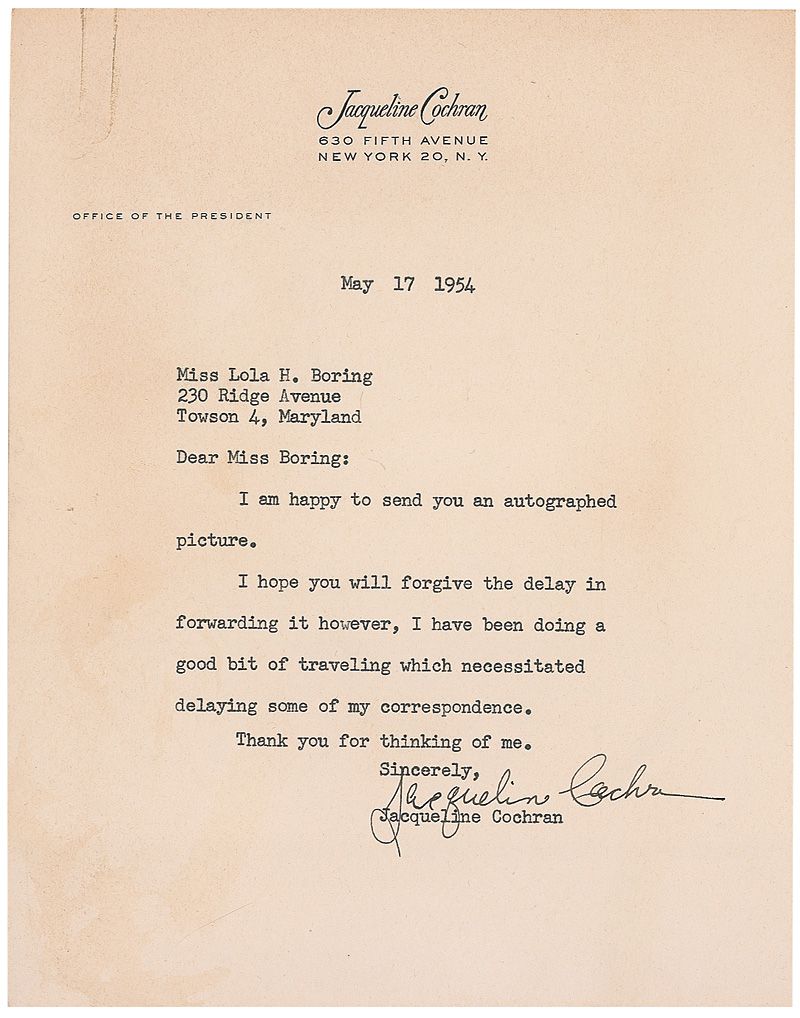 TLS, one page, 6.5 x 8, personal letterhead, May 17, 1954. Response to an autograph request. In full: “I am happy to send you an autographed picture. I hope you will forgive the delay in forwarding it however, I have been doing a good bit of traveling which necessitated delaying some of my correspondence.” In fine condition, with light irregular toning and a paperclip mark and impression to the upper left.