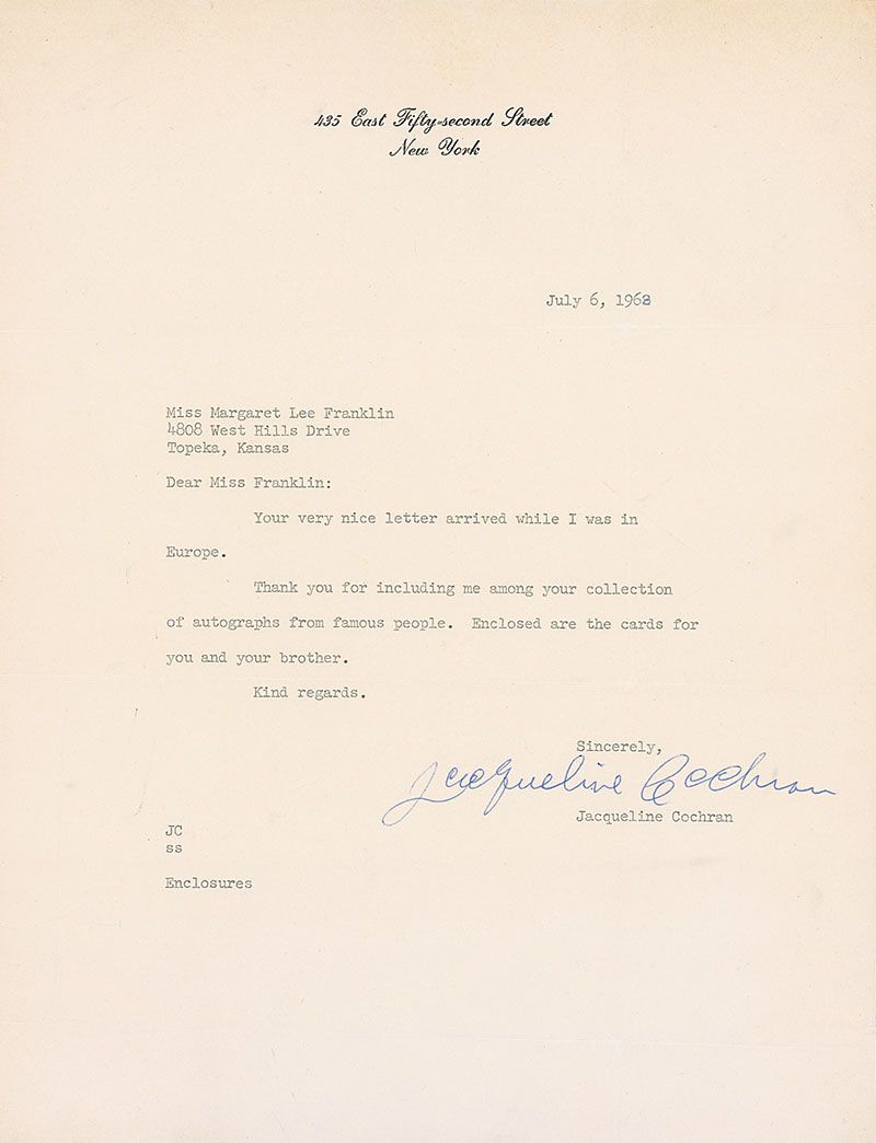 Female pilot (1906–1980) who was the first of her gender to break the sound barrier and is said to have more aviation records and awards than any pilot in the United States. TLS, one page, 8.5 x 11, personal letterhead, July 6, 1968. Short letter to an admirer. In part: “Your very nice letter arrived while I was in Europe. Thank you for including me among your collection of autographs from famous people.” In fine condition, with intersecting mailing folds.