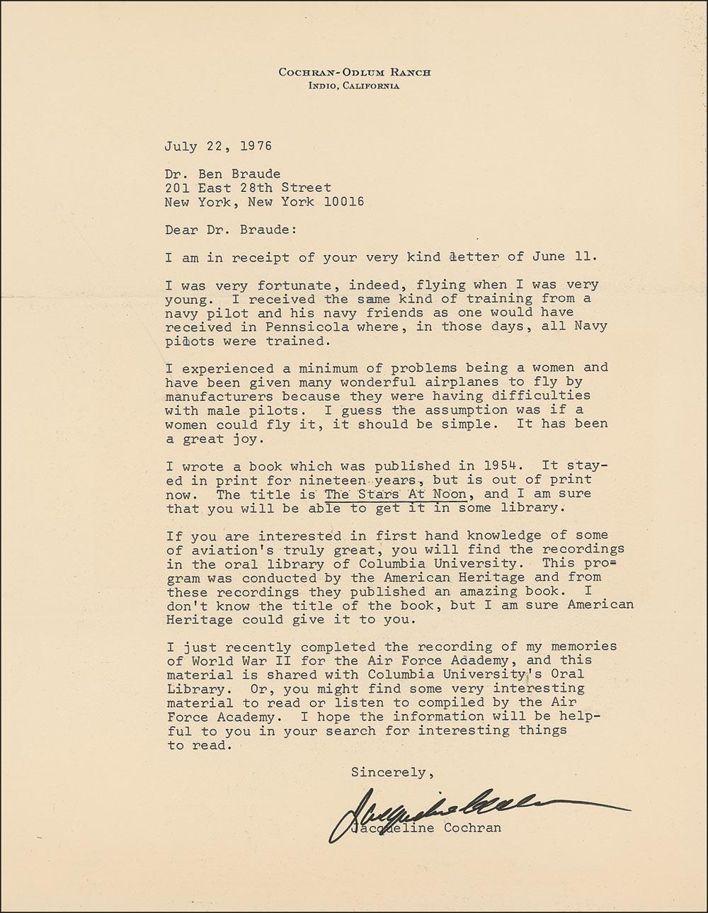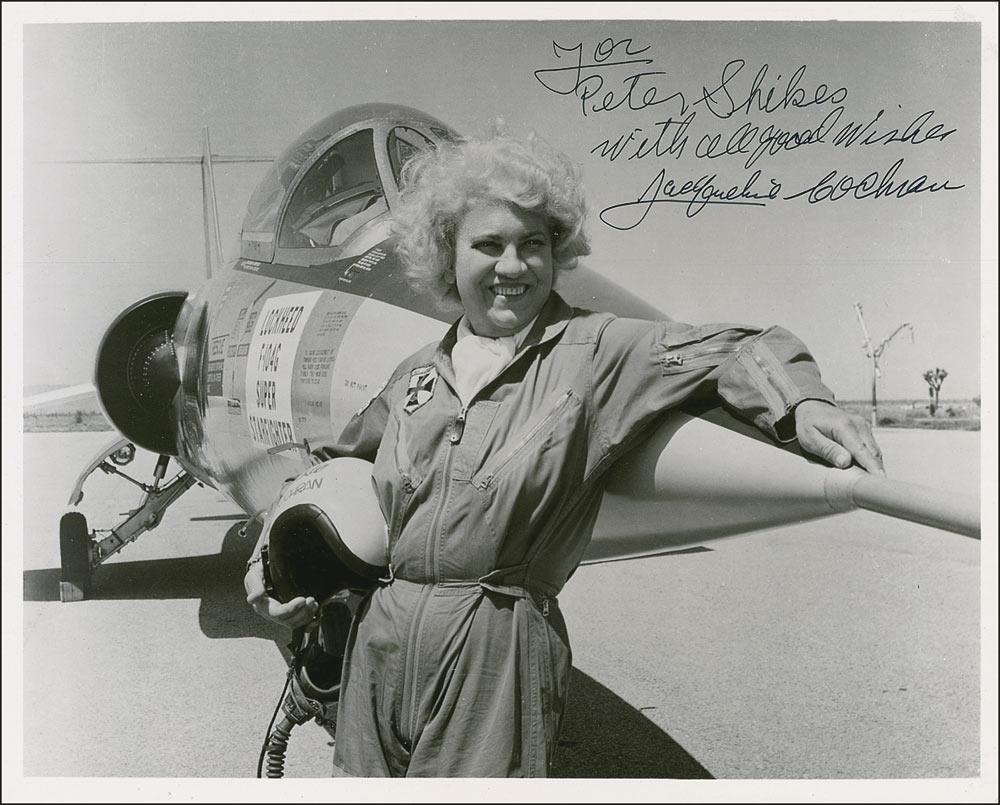 Female pilot (1906-1980) who was the first of her gender to break the sound barrier and is said to have more aviation records and awards than any pilot in the United States. Also a close friend of Chuck Yeager and Dwight D. Eisenhower. Two items: pearl-finish 10 x 8 photo of Cochran standing in front of a jet, signed and inscribed in black ink, “For Peter Shikes, with all good wishes, Jacqueline Cochran”; and a one page TLS, 8.5 x 11, dated July 22, 1976, responding to an admirer’s letter. In part: “I experienced a minimum of problems being a women [sic] and have been given many wonderful airplanes to fly by manufacturers because they were having difficulties with male pilots. I guess the assumption was if a woman could fly it, it should be simple. It has been a great joy.” Accompanied by the original mailing envelope. In fine condition, with some scattered edge creasing to photo’s edges. RRAuction COA.