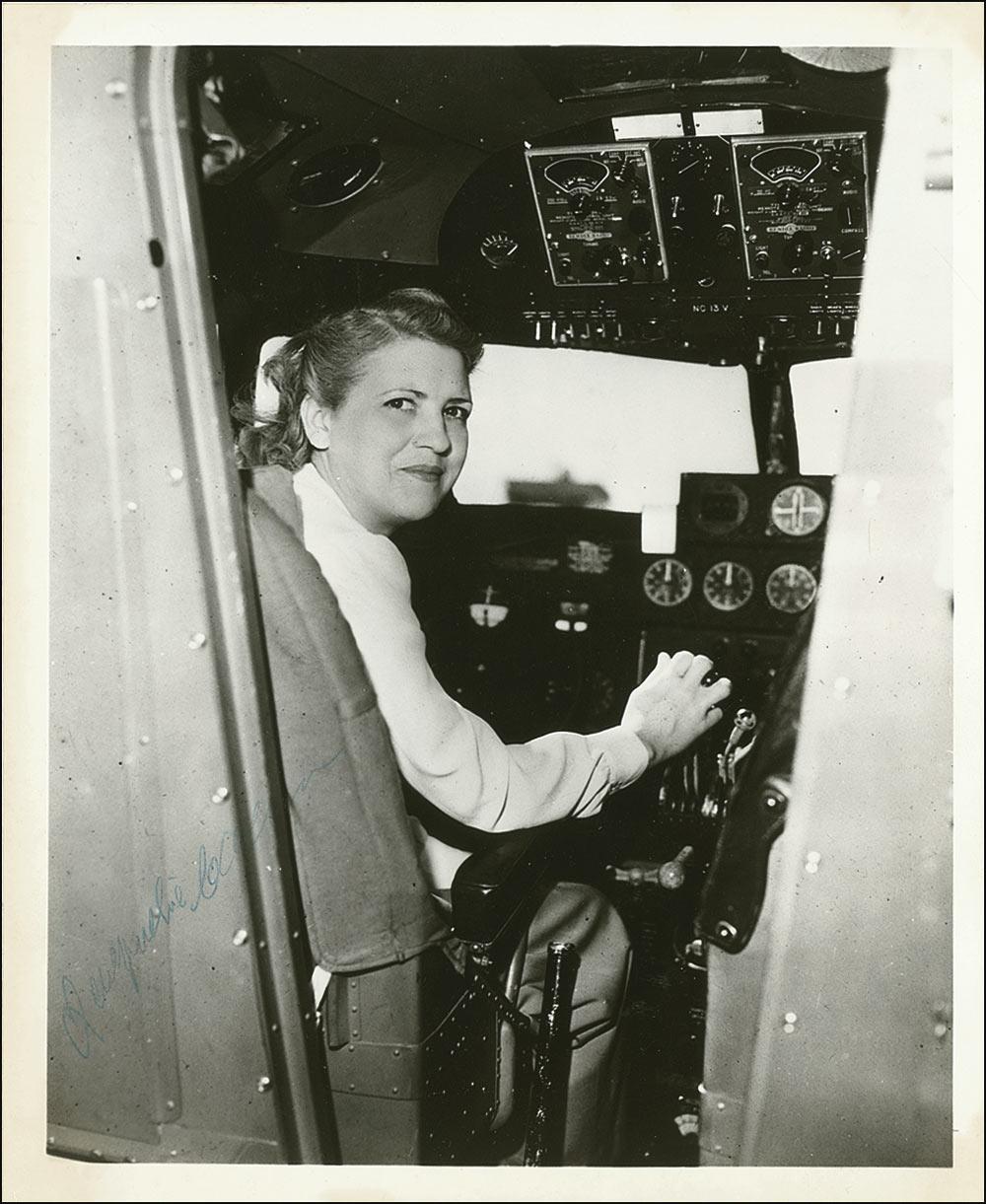 Female pilot (1906-1980) who was the first of her gender to break the sound barrier and is said to have more aviation records and awards than any pilot in the United States. Also a close friend of Chuck Yeager and Dwight D. Eisenhower. Glossy 8 x 10 photo of Cochran in the cockpit of a plane, signed in blue ballpoint. In very good condition, with areas of toning to borders, light surface impressions from a paperclip and another item signed on top of this one, and the signature a shade light. Accompanied by its original letter of transmittal. RRAuction COA.