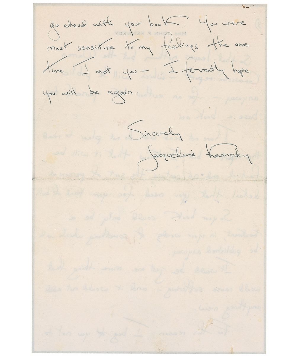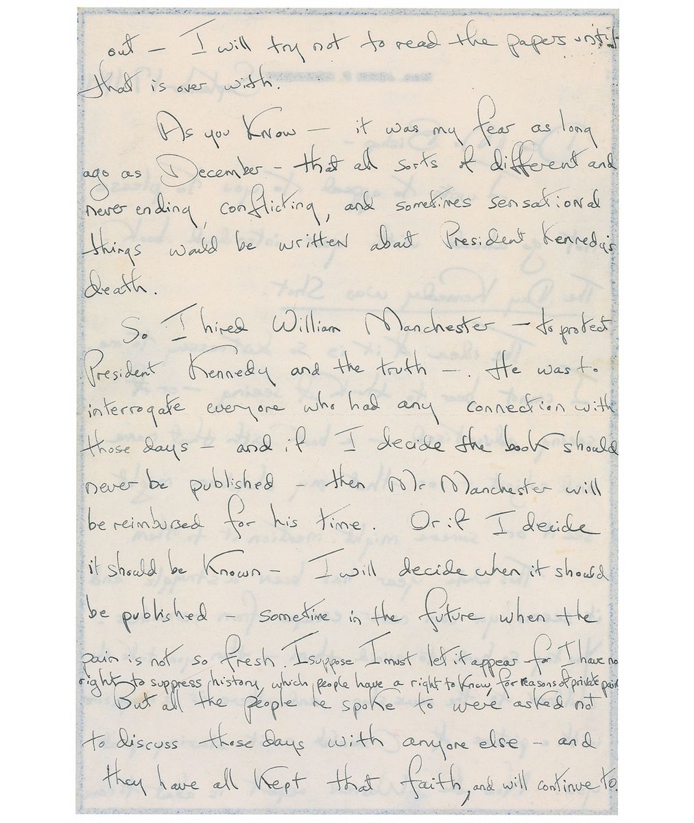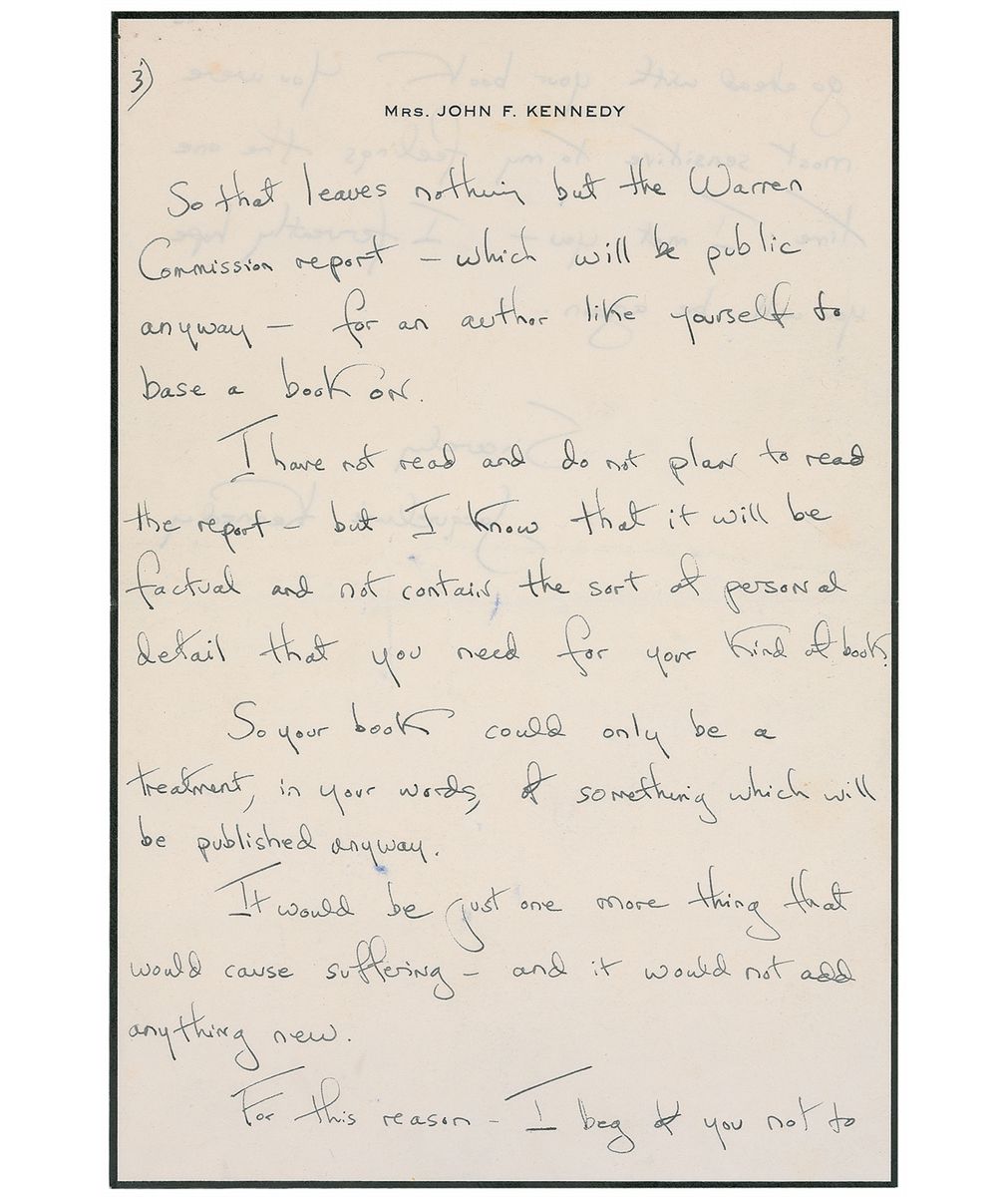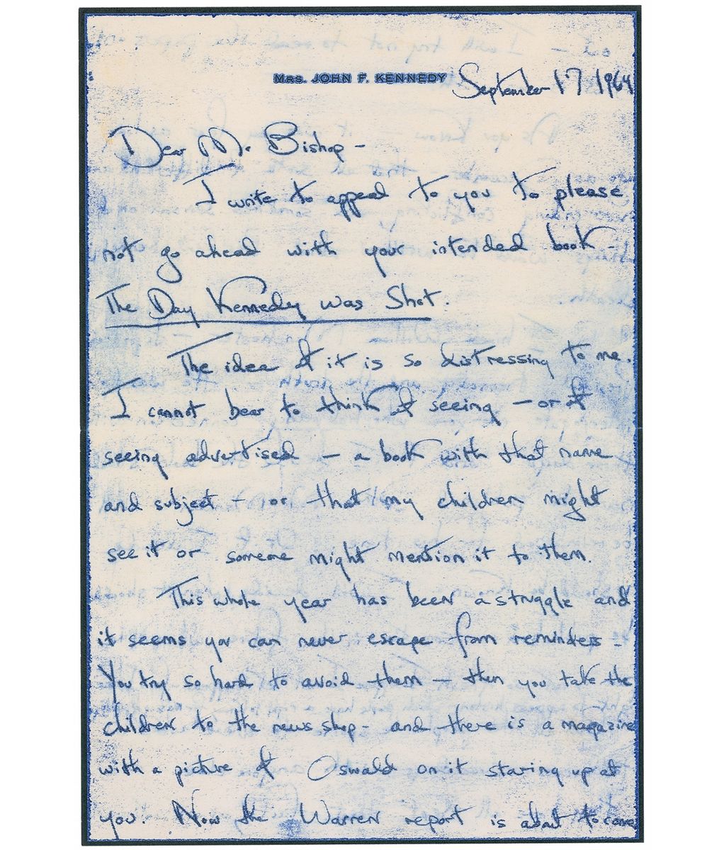 ALS, two pages both sides, 6.25 x 9.25, black-bordered personal letterhead, September 17, 1964. Mrs. Kennedy urgently appeals to Jim Bishop to relingquish plans to write his intended book, The Day Kennedy was Shot. In full: "I write to appeal to you to please not go ahead with your intended book—The Day Kennedy Was Shot. The idea of it so distressing to me. I cannot bear to think of seeing—or of seeing advertised—a book with that name and subject—or that my children might see it or someone might mention it to them. This whole year has been a struggle and it seems you can never escape from reminders. You try so hard to avoid them—then you take the children to the news shop—and there is a magazine with a picture of Oswald on it staring up at you. Now the Warren report is about to come out—I will try not to read the papers until it is over with. As you know, it was my fear as long ago as December [1963]—that all sorts of different and never ending, conflicting, and sometimes sensational things would be written about President Kennedy's death. So I hired William Manchester—to protect President Kennedy and the truth. He was to interrogate everyone who had any connection with those days—and if I decide the book should never be published—then Mr. Manchester will be reimbursed for his time. Or if I decide it should be known, I will decide when it should be published—some time in the future when the pain is not so fresh.
