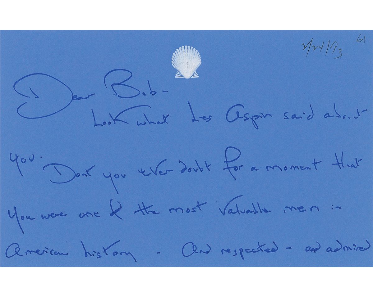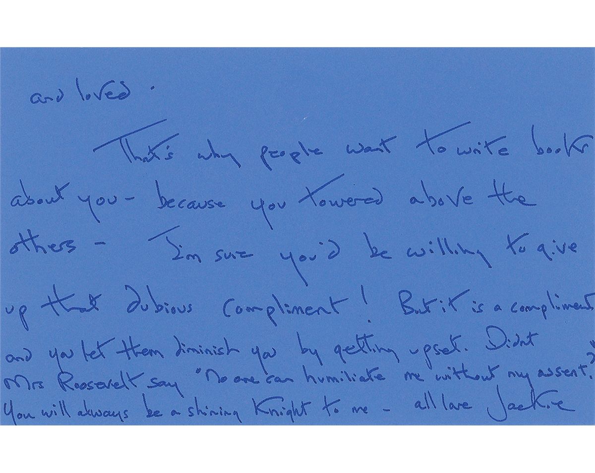 ALS signed “Jackie,” one page both sides, 6.25 x 4, sea shell letterhead, no date. Letter to Secretary of Defense Robert McNamara, dated “2/24/93,” at the top of the first page in McNamara’s hand. In full: “Look what Les Aspin said about you. Don’t ever doubt for a moment that you were one of the most valuable men in American history—And respected—and admired and loved. That’s why people want to write books about you—because you towered above the others—I’m sure you’d be willing to give up that dubious compliment! But it is a compliment and you let them diminish you by getting upset. Didn’t Mrs. Roosevelt say ‘No one can humiliate me without my assent?’ You will always be a shining knight to me.” In fine condition. A hearfelt letter probably sent in response to an earlier downcast note from McNamara. Provenance: The Robert S. McNamara Collection, Sotheby’s 2012.