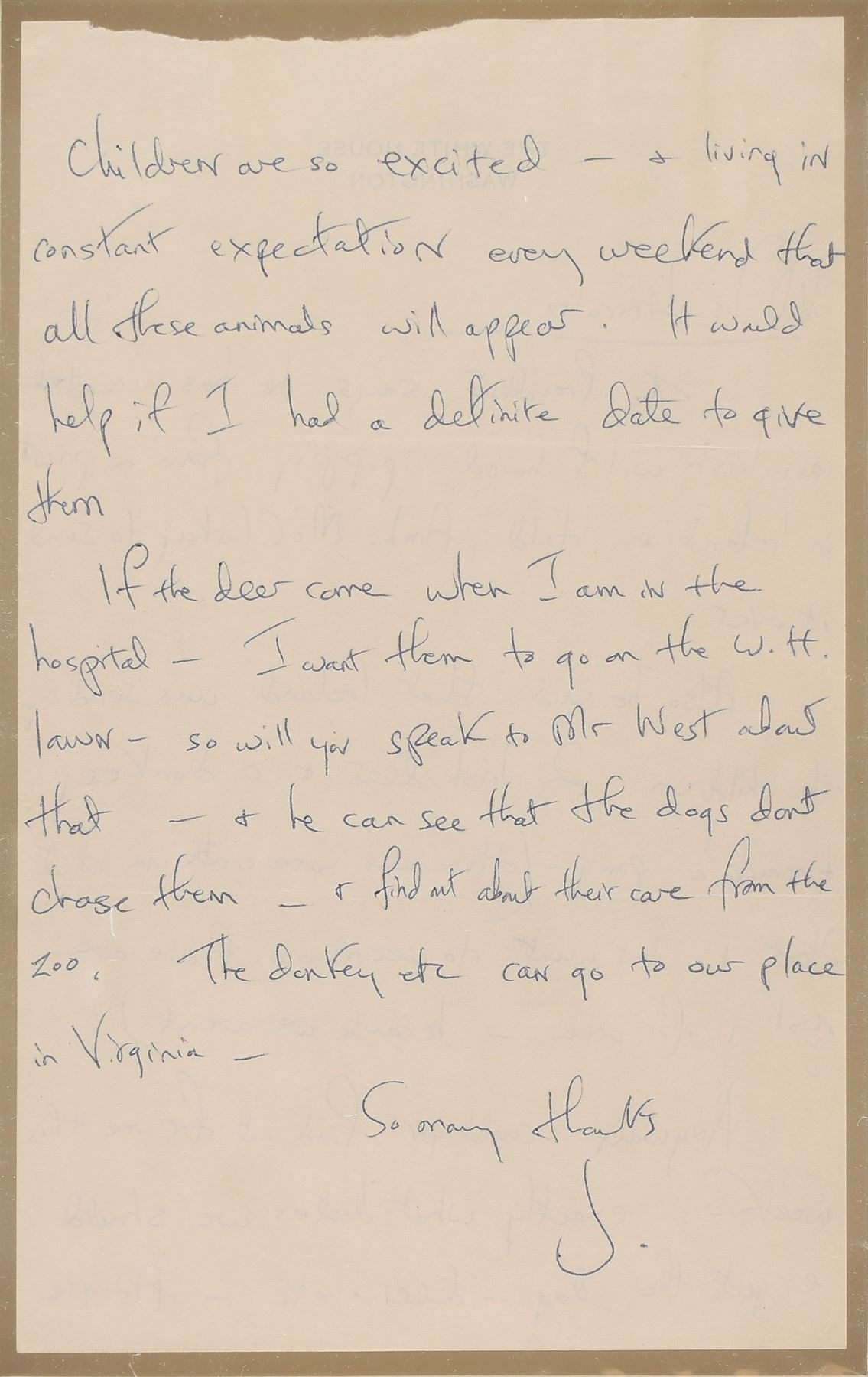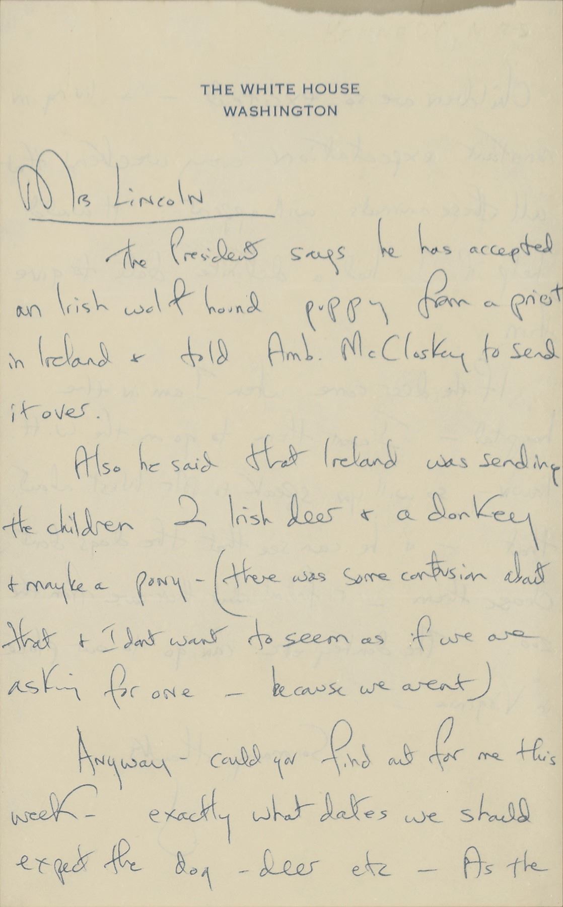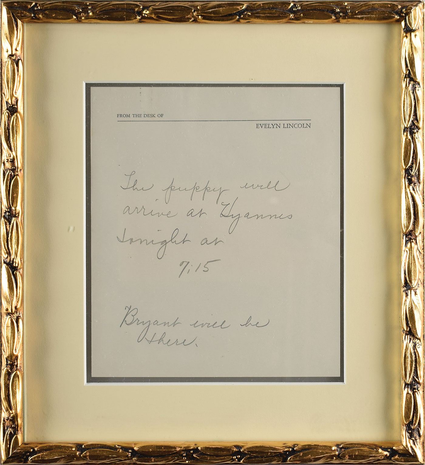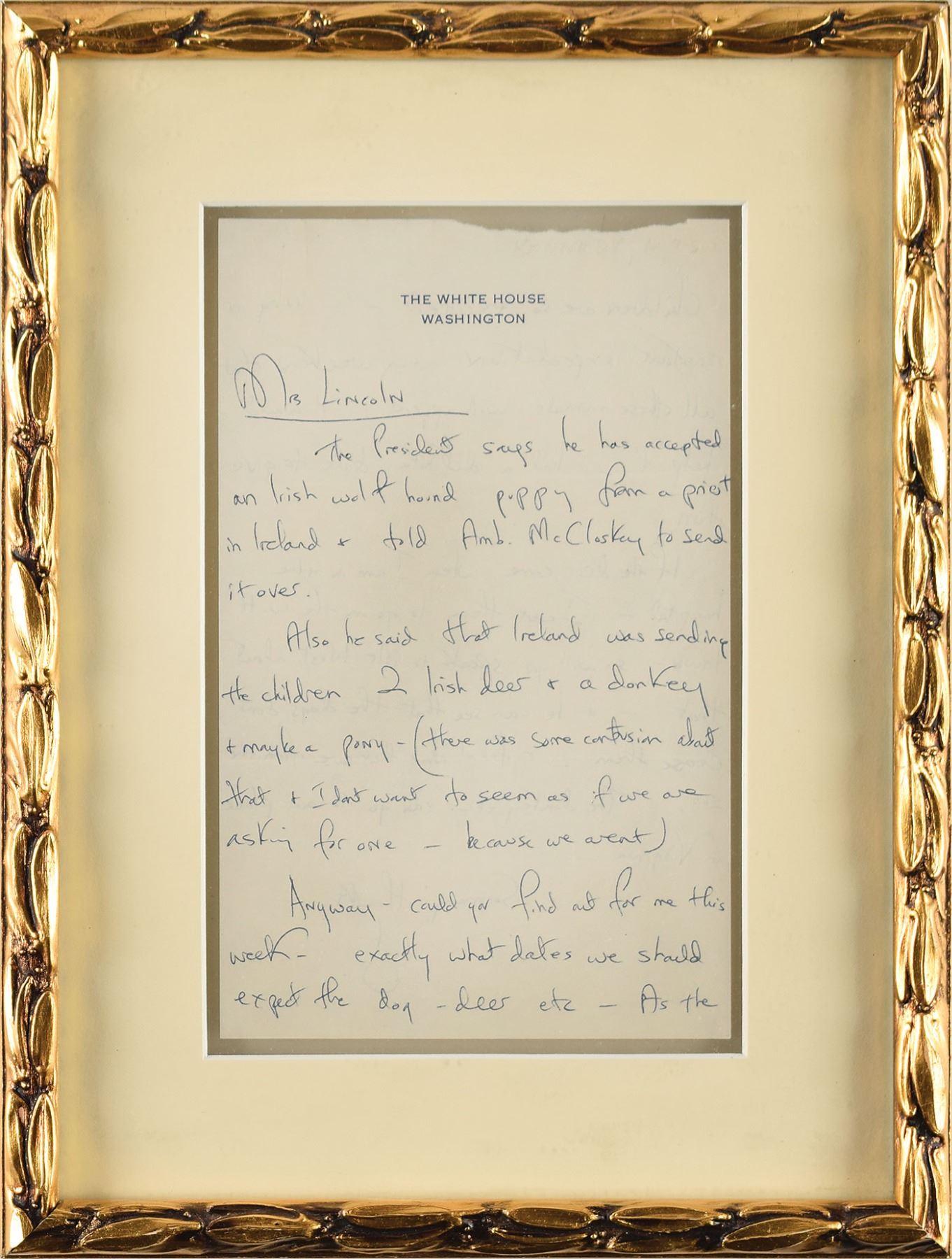 ALS as first lady, signed “J.,” one page both sides, 5 x 8, White House letterhead, no date (circa August 1963). Letter to presidential secretary Evelyn Lincoln, in full: "The President says he has accepted an Irish wolfhound puppy from a priest in Ireland & told Amb. McCloskey to send it over. Also he said that Ireland was sending the children 2 Irish deer & a donkey & maybe a pony—(there was some confusion about that & I don't want to seem as if we are asking for one—because we aren't). Anyway—could you find out for me this week—exactly what dates we should expect the dog—deer etc—As the children are so excited—& living in constant expectation every weekend that all these animals will appear. It would help if I had a definite date to give them. If the deer come when I am in the hospital—I want them to go on the W.H. lawn—so will you speak to Mr. West about that—& he can see that the dogs don't chase them—& find out about their care from the zoo. The donkey etc can go to our place in Virginia." Matted and framed to an overall size of 9.25 x 12.25, with a window in the backing for viewing the reverse. Includes a handwritten response from Lincoln on an off-white sheet of 6 x 7 personal stationery, which reads: "The puppy will arrive at Hyannis tonight at 7:15. Bryant will be there." The Lincoln is similarly matted and framed to an overall size of 10.25 x 11.15. In overall fine condition. Provenance: Guernsey's, The John F. Kennedy Auction, March 1998.