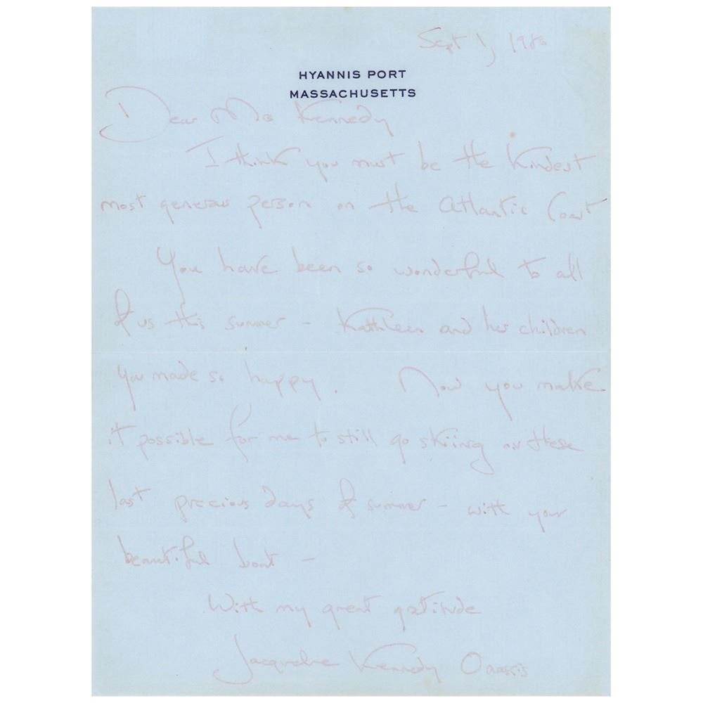 ALS signed ‰ÛÏJacqueline Kennedy Onassis,‰Û one page, 5.75 x 7.75, Hyannis Port letterhead, September 1, 1986. Handwritten letter to "Mrs. Kennedy," presumably her former mother-in-law, Rose Kennedy, in full: "I think you must be the kindest, most generous person on the Atlantic Coast. You have been so wonderful to all of us this summer‰ÛÓKathleen and her children you made so happy. Now you make it possible for me to still go skiing on these last precious days of summer‰ÛÓwith your beautiful boat. With my great gratitude." In fine condition, with light creasing, and overall fading.