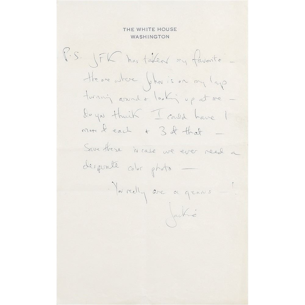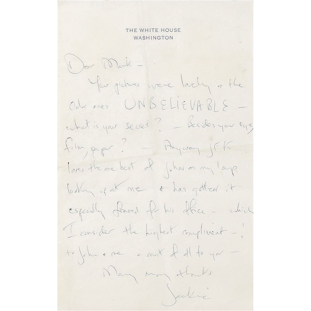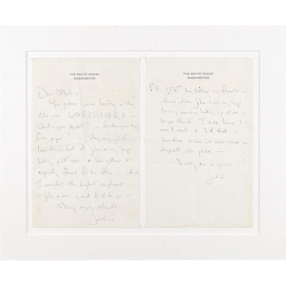 ALS signed “Jackie,” two pages, 5 x 8, White House letterhead, no date. Handwritten letter to photographer Mark Shaw, in full: "Your pictures were lovely & the color ones UNBELIEVABLE—what is your secret?—Besides your eye, film, paper?—Anyway, JFK loves the one best of John on my lap looking up at me & has gotten it especially framed for his office—which I consider the highest compliment—to John & me & most of all to you." She adds a postscript on the second page: "JFK has taken my favorite—the one where John is on my lap turning around & looking up at me—do you think I could have 1 more of each & 3 of that—save these in case we ever need a desperate color photo—You really are a genius!" Removably mounted side-by-side and matted to an overall size of 13.5 x 11. In very good to fine condition, with creasing and intersecting folds.