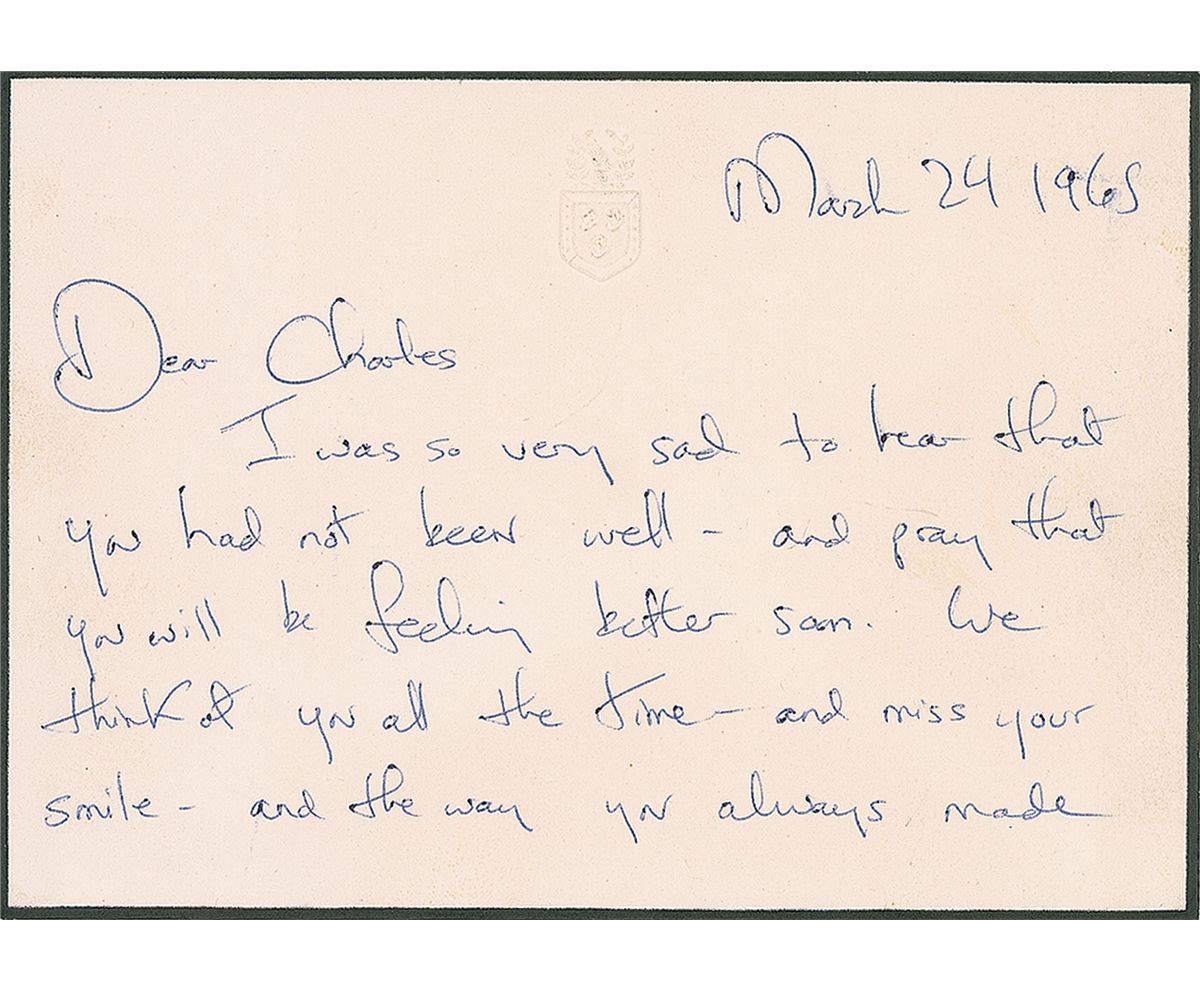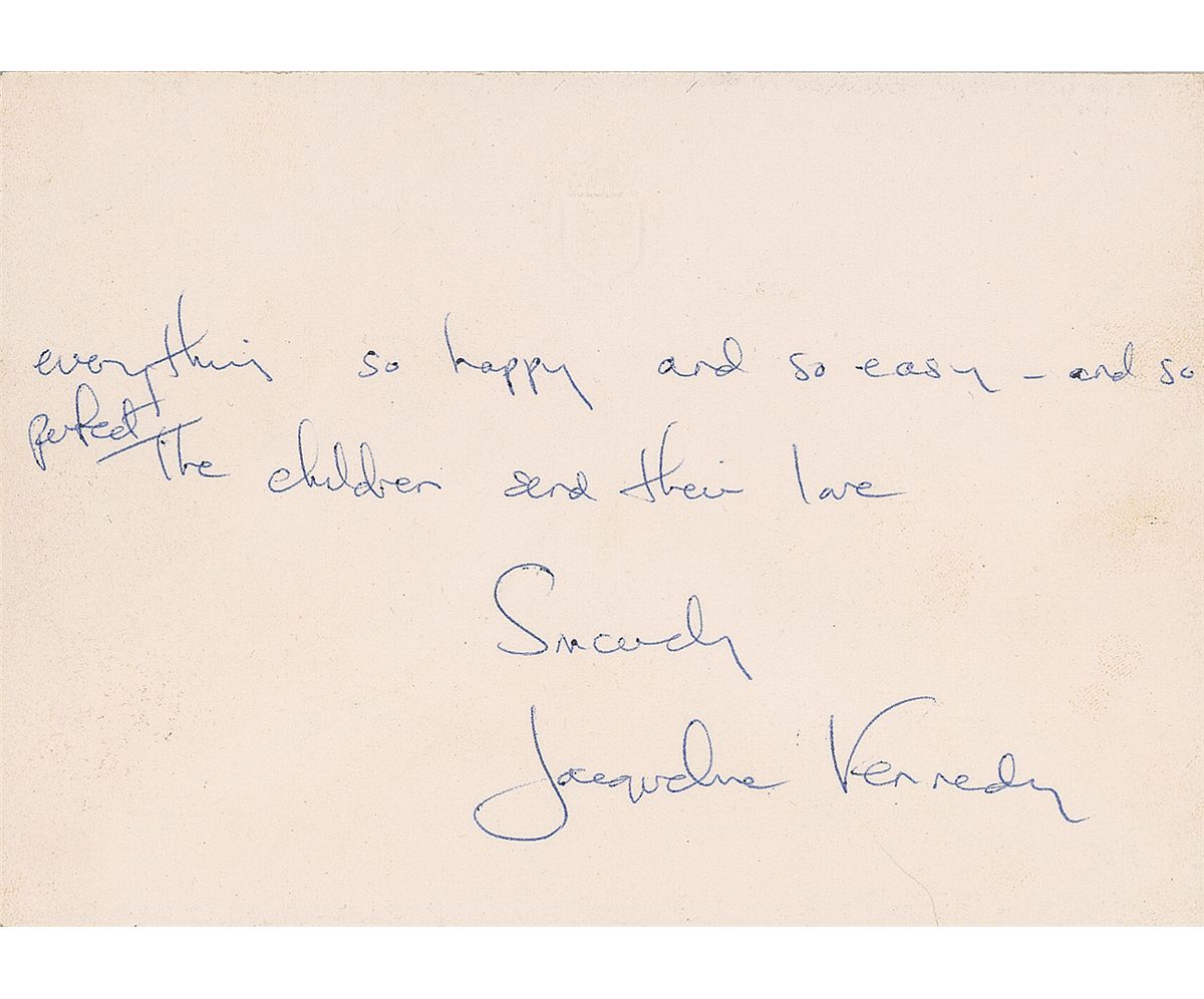 ALS signed “Jacqueline Kennedy,” one page both sides, 5 x 3.5, black-bordered JFK mourning stationery letterhead, March 24, 1965. Letter to White House maitre-de, Charles Ficklin. In full: “I was so very sad to hear that you had not been well—and pray that you will be feeling better soon. We think of you all the time—and miss your smile— and the way you always made everything so happy and so easy—and so perfect. The children send their love.” In fine condition. Charles Ficklin had faithfully served the President and Mrs. Kennedy as White House maitre-de, developing a close relationship with the first lady.