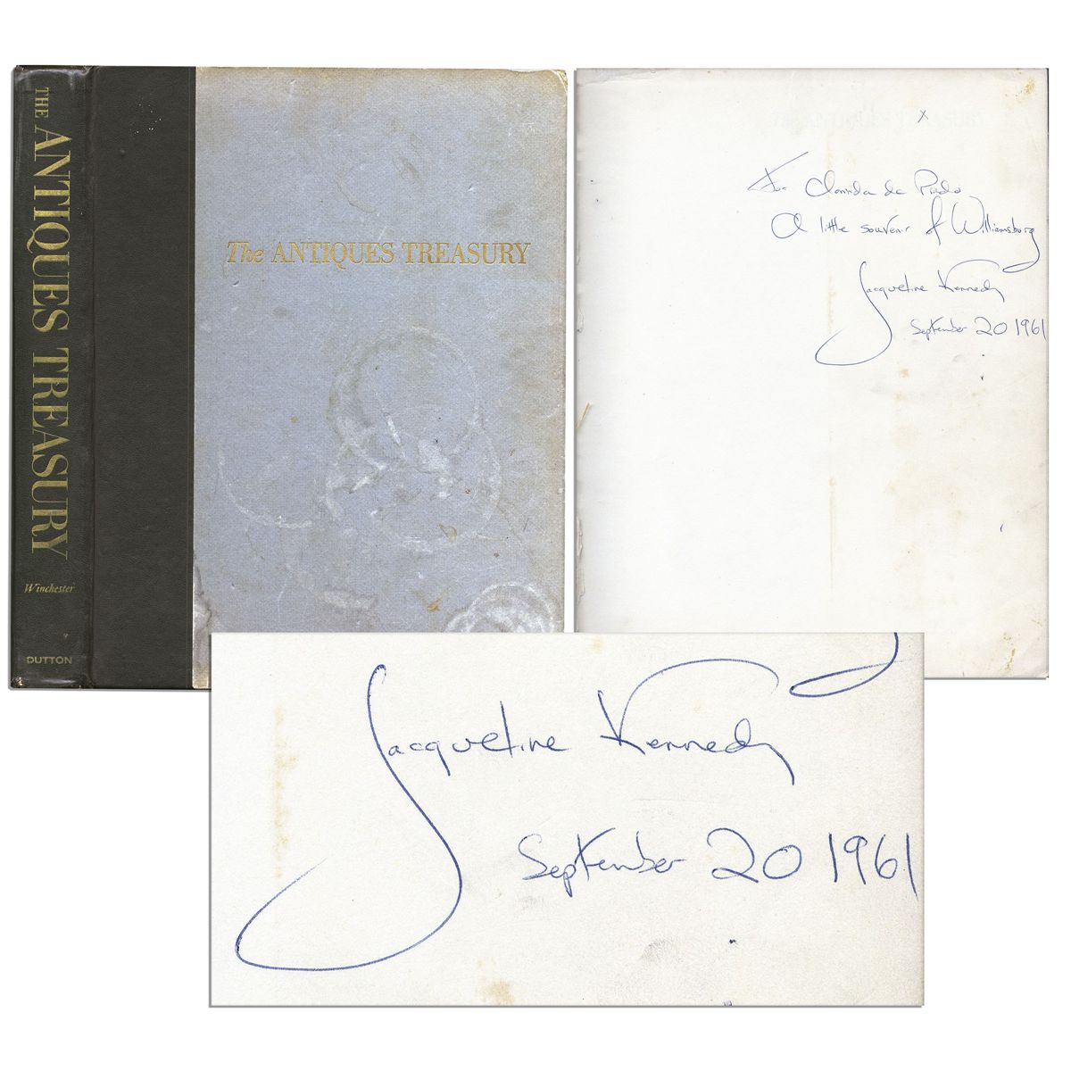 Book inscribed and signed by Jackie Kennedy as First Lady during the first few months of JFK's presidency. Dedication on the front free endpaper reads, ''For Clarinda de Prado / A little souvenir of Williamsburg / Jacqueline Kennedy / September 20 1961''. Book is titled, ''The Antiques Treasury of Furniture and Other Decorative Arts At [7 Historic Estates]...'', published by Antiques Magazine, E.P. Dutton & Company: New York: 1959. Accompanied by an 8'' x 10'' black and white photo of the Kennedys with Peruvian President and Mrs. Manuel Prado Ugarteche. Runs 319pp. Bound in green paper boards with green faux leather spine and gilt lettering. Measures 9.5'' x 12.25''. Exterior is detached from interior. Rings to front cover and surface loss to board edges, else very good.