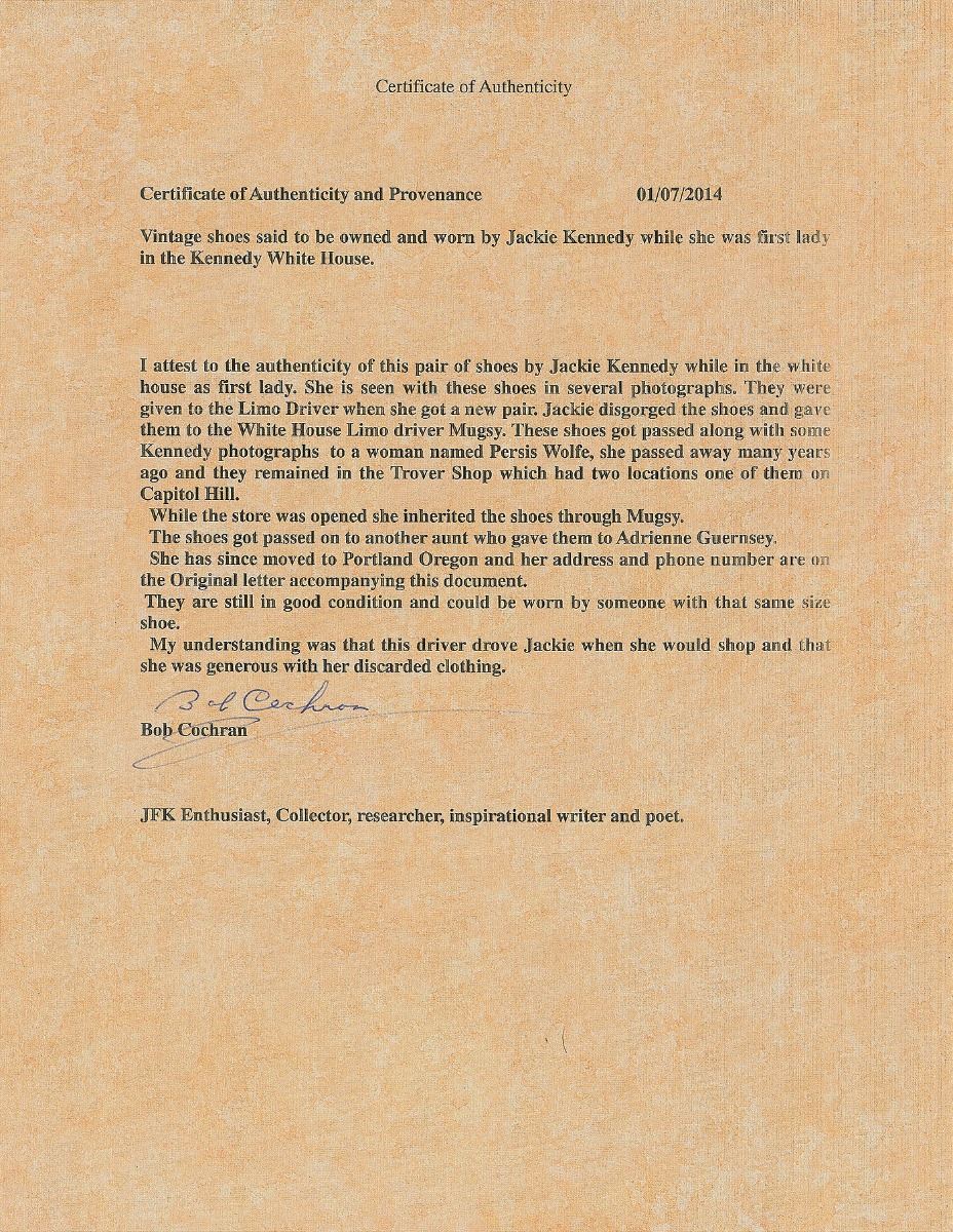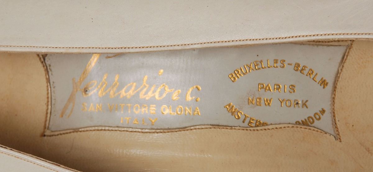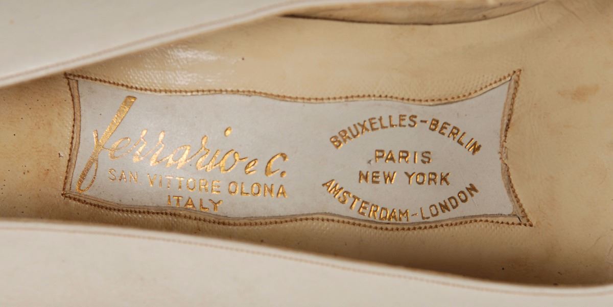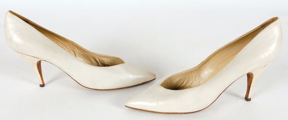 Jacqueline Kennedy’s personally-owned and -worn pair of cream-colored high-heeled designer shoes with supple leather uppers and brown leather soles, with labels on both insoles imprinted in gilt, “Ferrario e C., San Vittore Olona, Italy.” The tags also list the cities of Brussels, Berlin, Paris, New York, Amsterdam, and London. Both are stamped on the soles as size “40” and “Made in Italy.” The shoes measure 10? long and 6? tall at their highest point. In very good condition, with expected general wear from frequent use. Accompanied by a letter of provenance tracing the history of these shoes, stating that they were originally given to White House limo driver John J. ‘Muggsy’ O’Leary. Muggsy later gave them to his friend, the manager of a Capitol Hill bookstore called Trover Shop, who passed them down through her family; they were then sold by a niece in 2014.