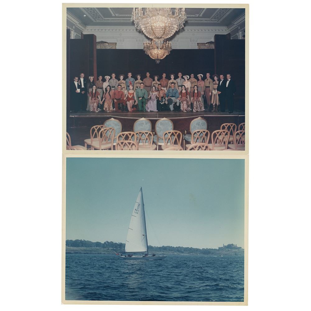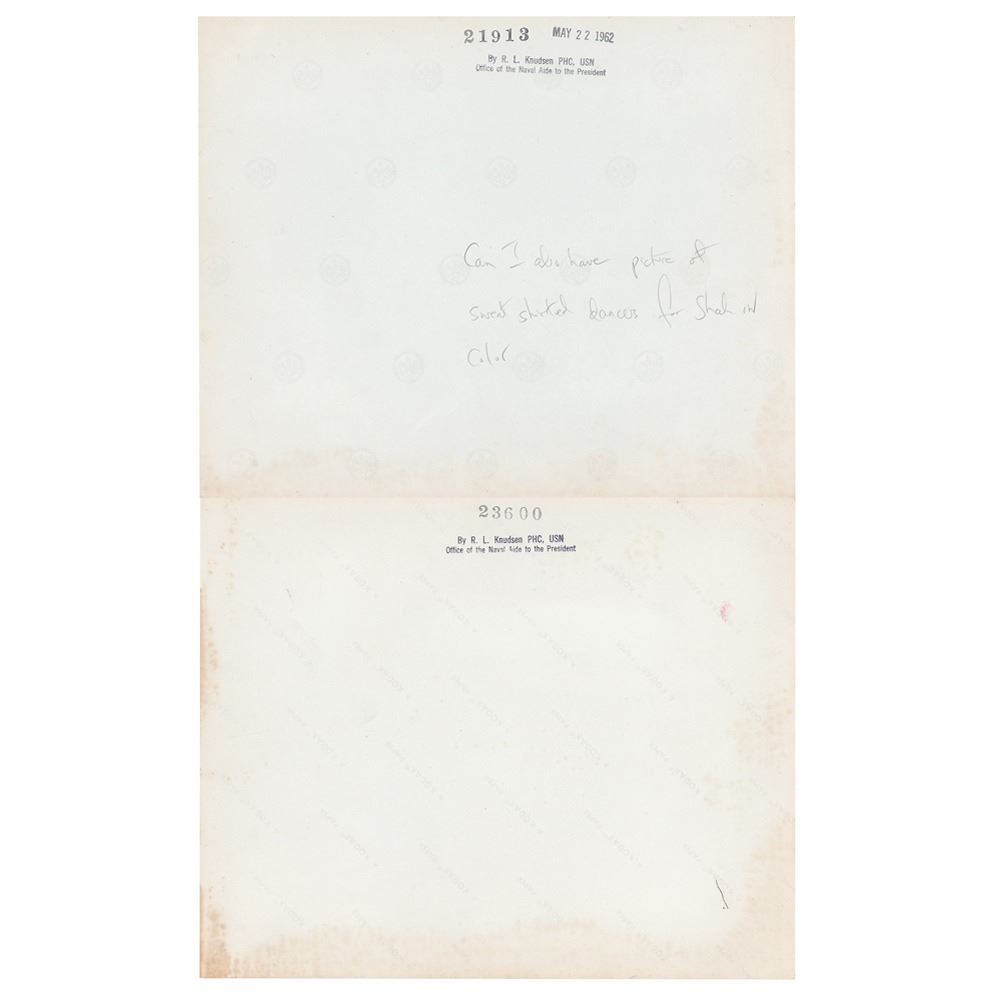 Unusual official original color glossy 10 x 8 photo of a performance troupe at the White House, annotated on the reverse in pencil by First Lady Jacqueline Kennedy, "Can I also have picture of sweat shirted dancers for Shah in color." Also stamped on the reverse: "21912, May 22, 1962, By R. L. Knudsen PHC, USN, Office of the Naval Aide to the President." Also includes an official color glossy 10 x 8 photo of the Australian racing yacht 'Gretel,' which competed in the America's Cup in 1962, also bearing Knudsen's credit stamp on the reverse. In overall fine condition.