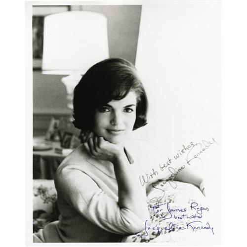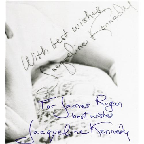 <B>Jacqueline Kennedy Inscribed Signed Photograph,</B></I> "<I>For James Rogan best wishes Jacqueline Kennedy</B></I>." A glossy 8" x 10" White House publicity shot with a pre-printed signature and sentiment above the actual inscription. The first lady is shown in her prime during the "Camelot" years. Bold inscription and autograph in dark blue ink.