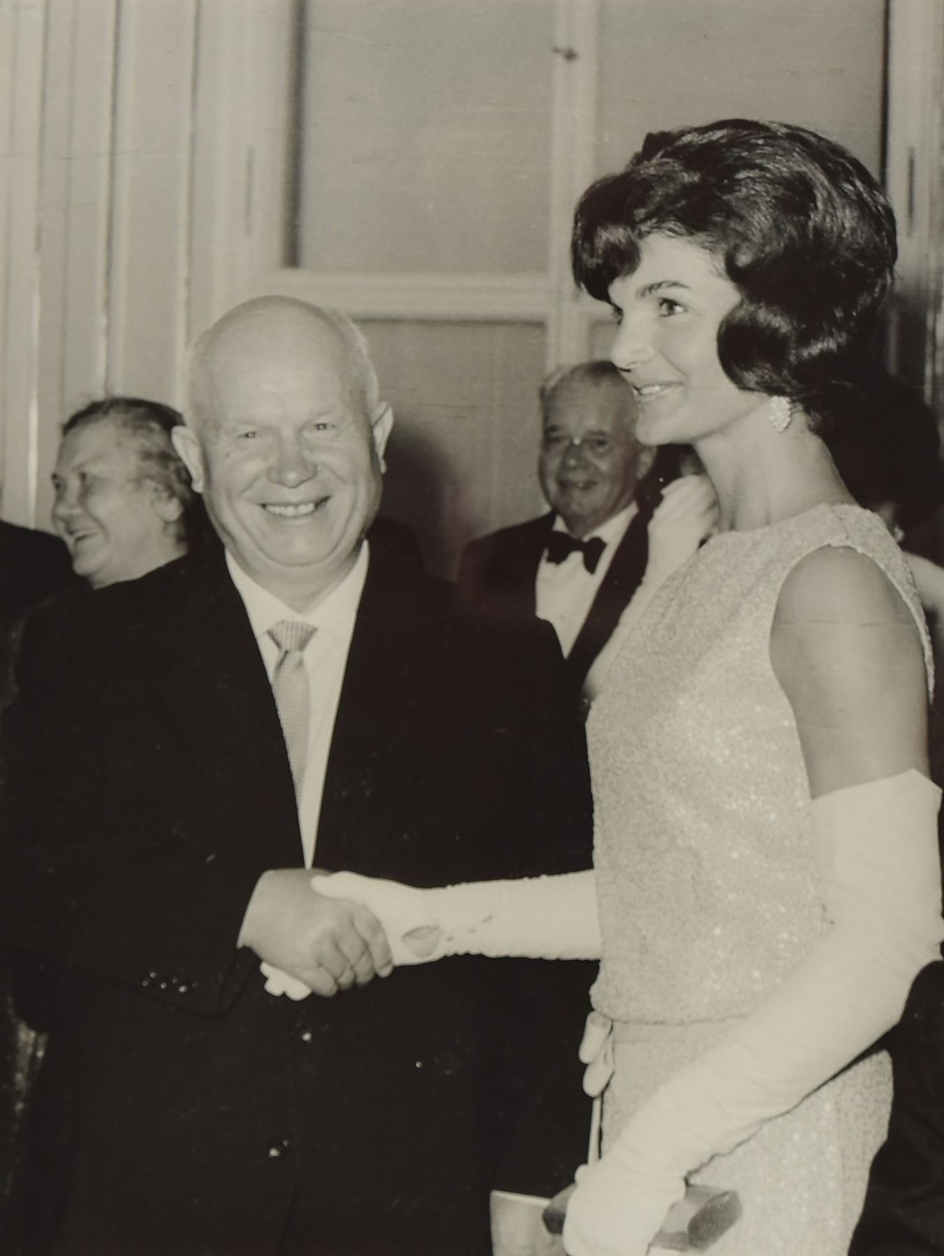 Rare original photo (stamped on reverse) of Jacqueline Kennedy posing with Soviet Premier Nikita Khrushchev in Vienna, Austria, during the first summit meeting between President Kennedy and Khrushchev in June 1961.