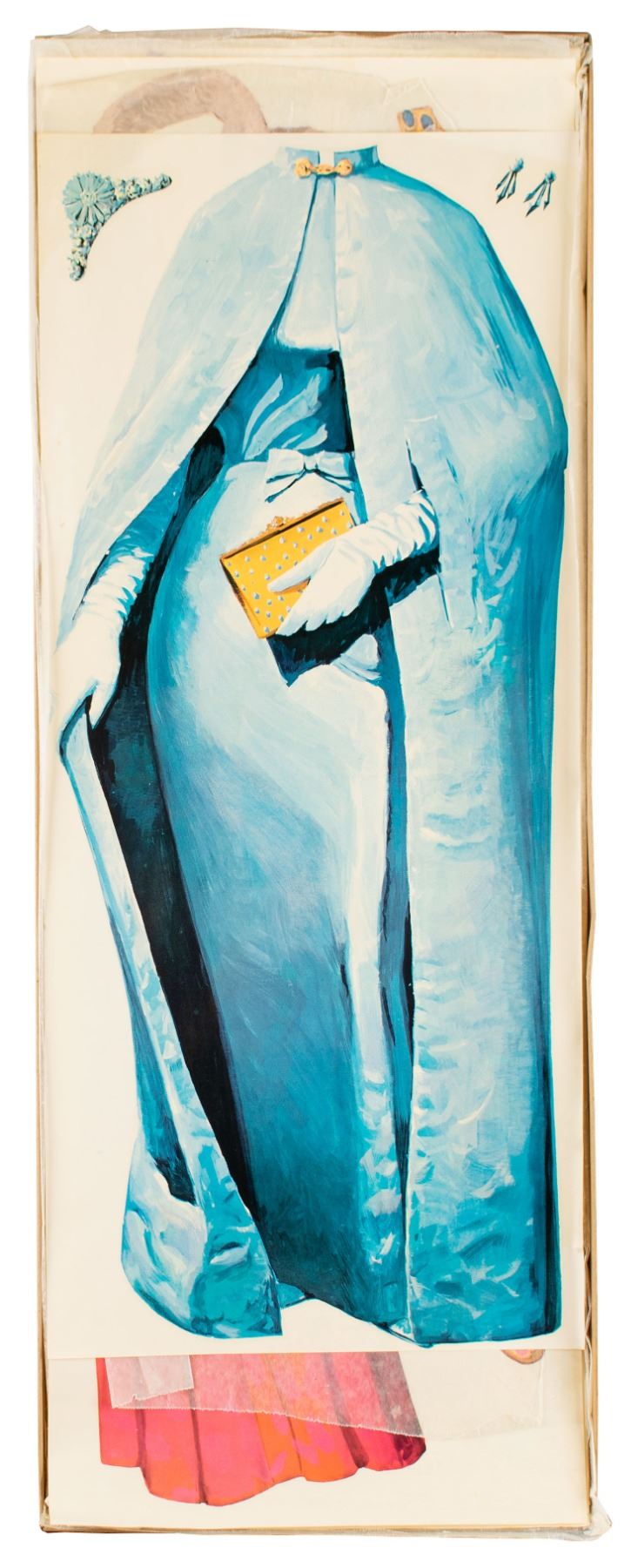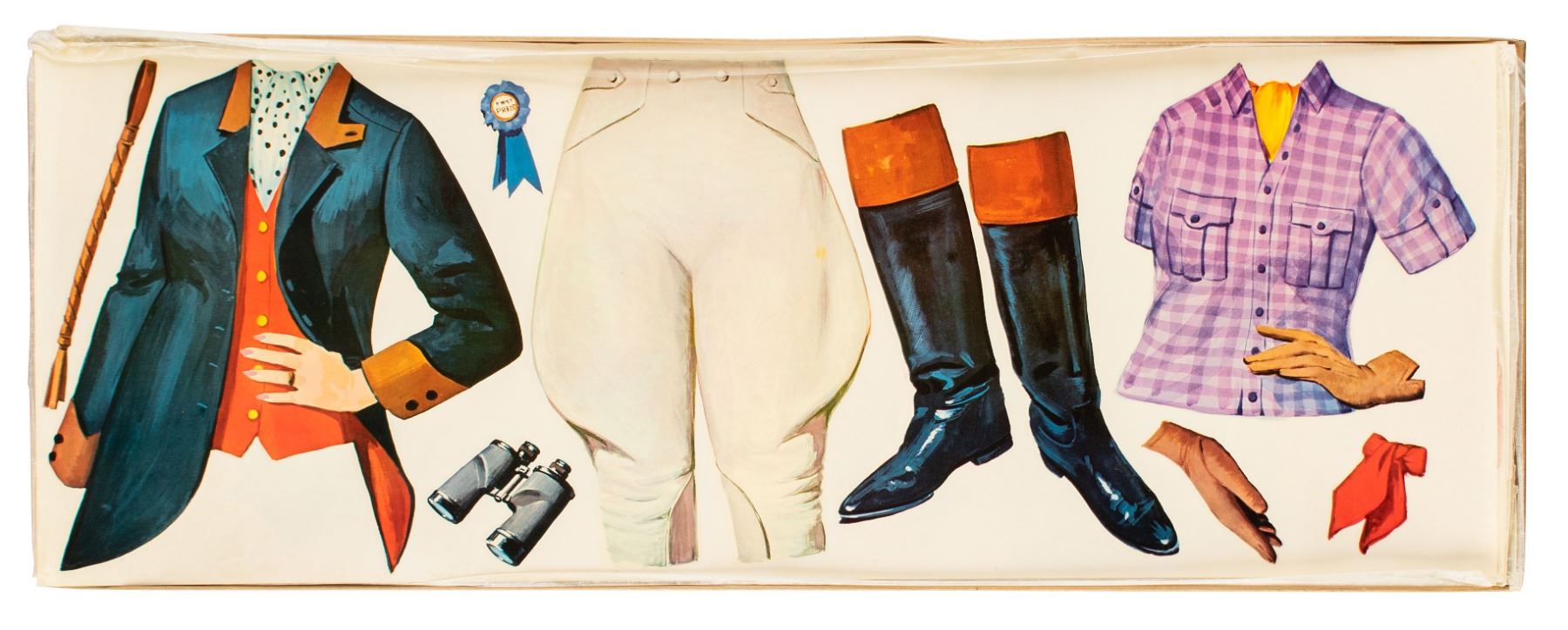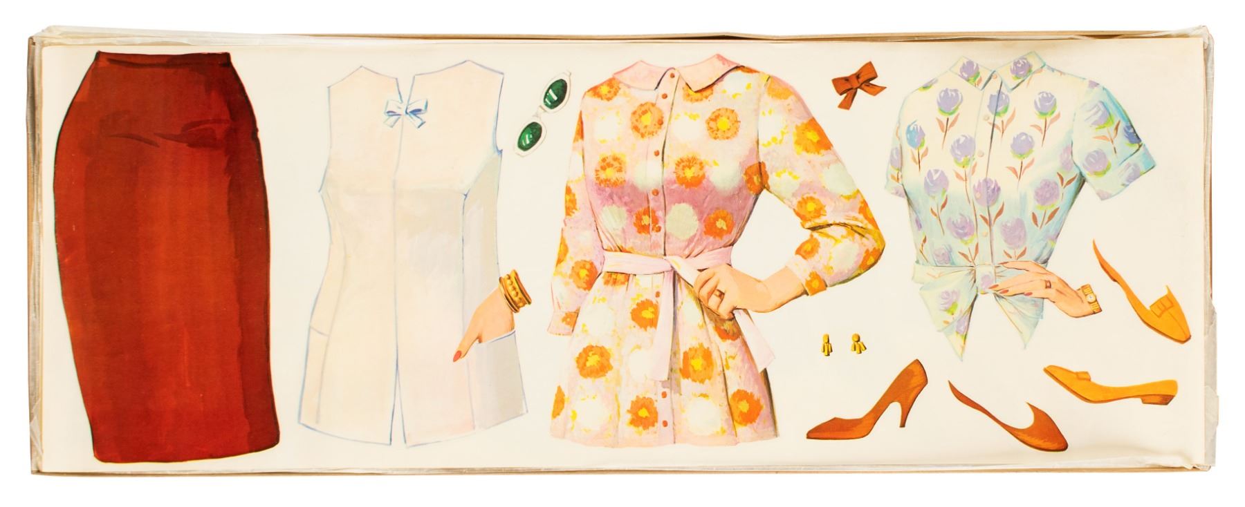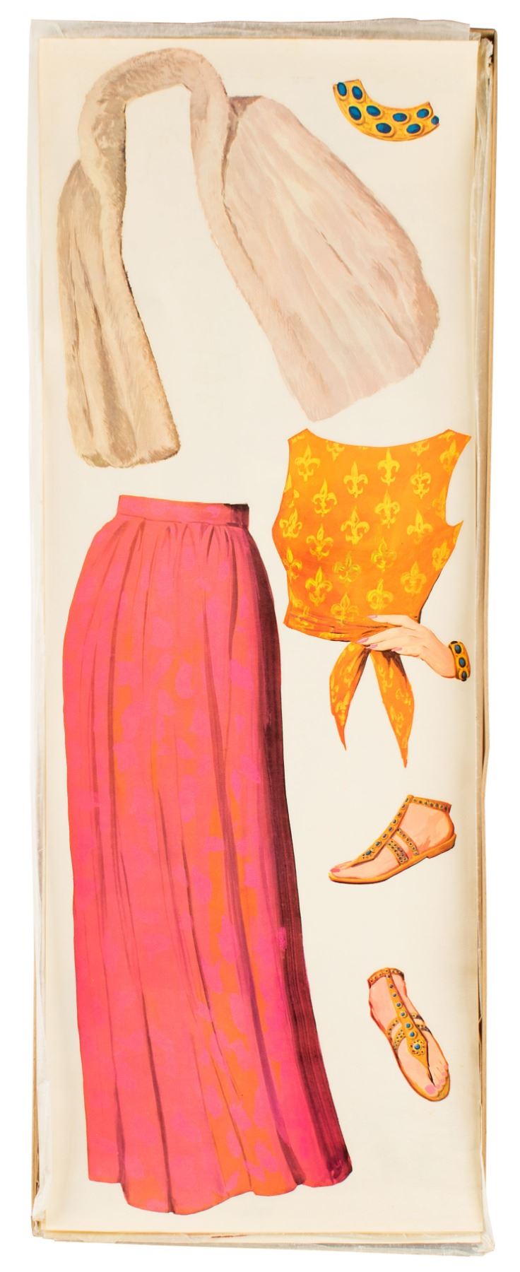 29? x 11?. Includes multiple sheets of various outfits and accessories to be cut-out and affixed to the cardboard doll without paste. In unused condition and a great visual artifact showcasing Jackie's great sense of style.