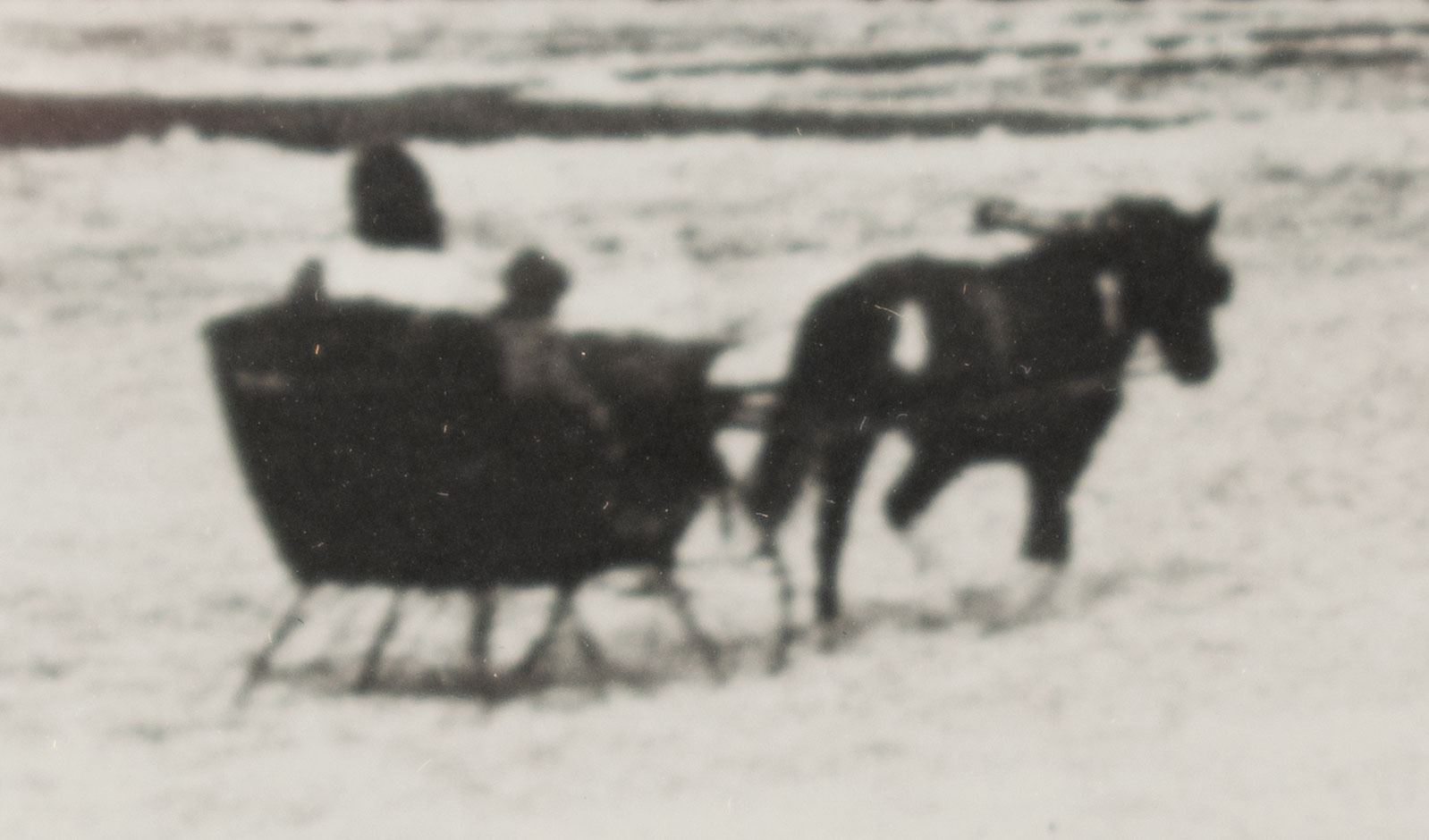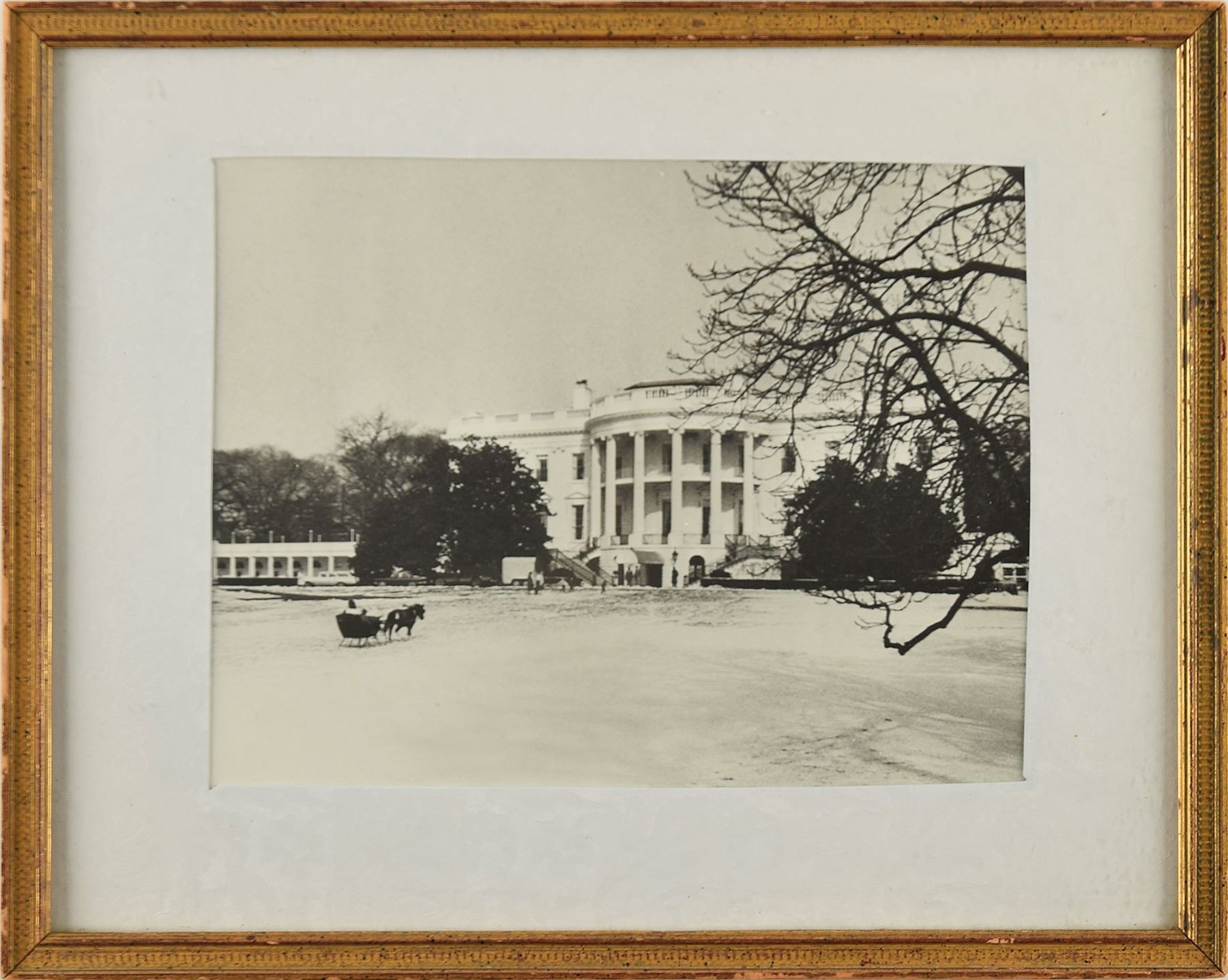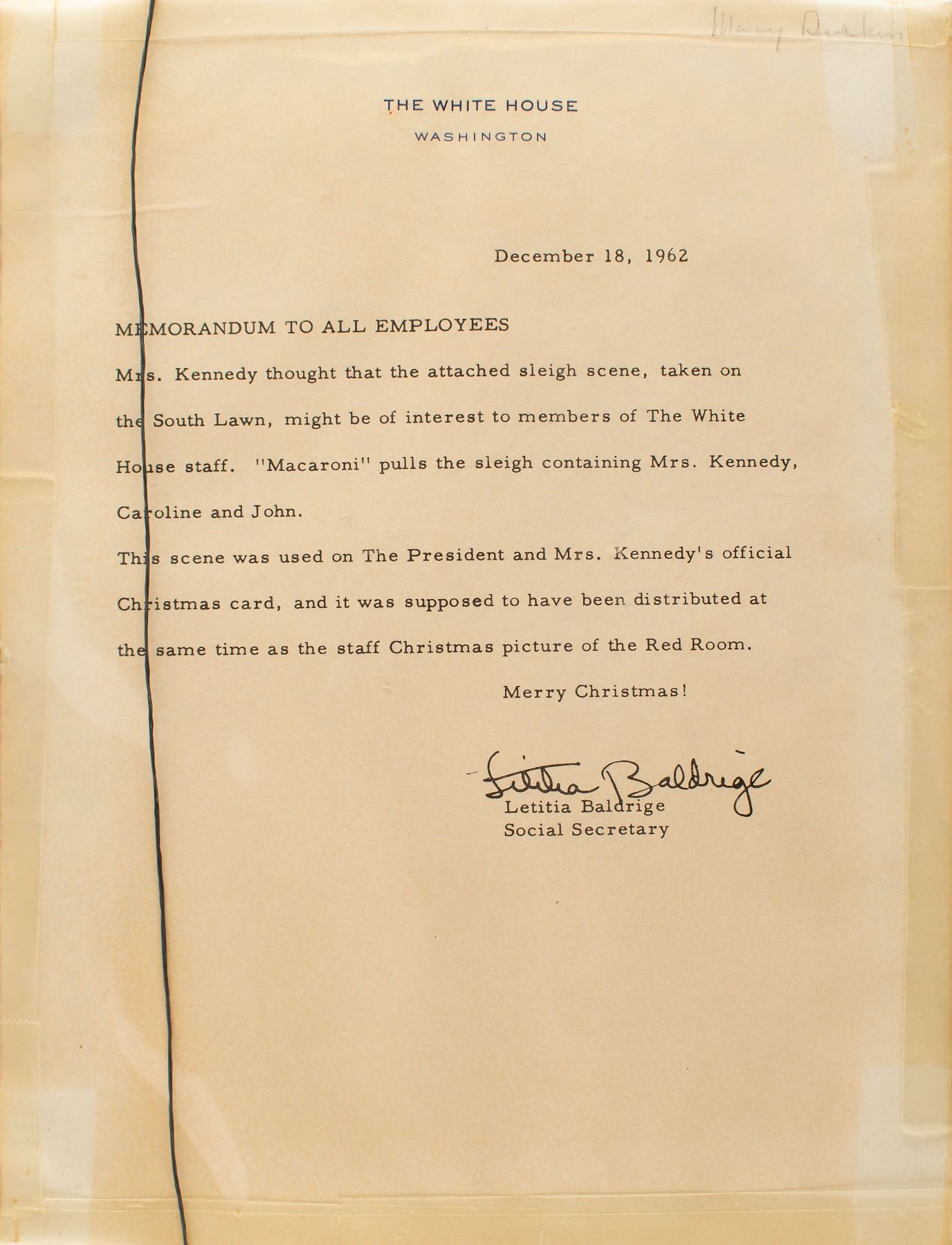A beautifully matted and framed photograph originally owned by White House secretary Mary Durkin. According to this letter from Dec. 18, 1962 attached to the back of this frame signed by Letitia Baldrige, Social Secretary says that this scene was used on the President and Mrs. Kennedy's official Christmas card from 1962 and was also to have been distributed at the same time as the staff Christmas picture of the Red Room but apparently was not, so Mrs. Kennedy was now instructing Ms. Baldrige to offer this classic image to White House Staff. The photograph features a beautiful image of "Macaroni" (Caroline's horse) pulling the sleigh across the South Lawn driven by Mrs. Kennedy, with Caroline and John sitting next to her.