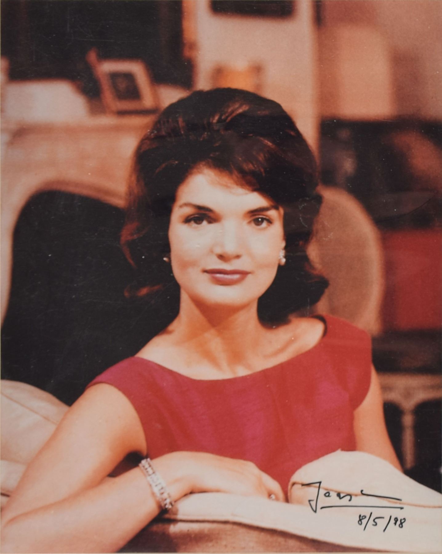 One of the best color photographic portraits of Jacqueline Kennedy taken circa 1961-62. Boldly signed by the famous photographer Jacques Lowe on Aug. 5, 1998 who took this picture. Tragically all of Jacques Lowe's negatives were destroyed on 9/11/2001 when the Twin Towers were destroyed along with Lowe's negatives that were kept there for safe keeping.