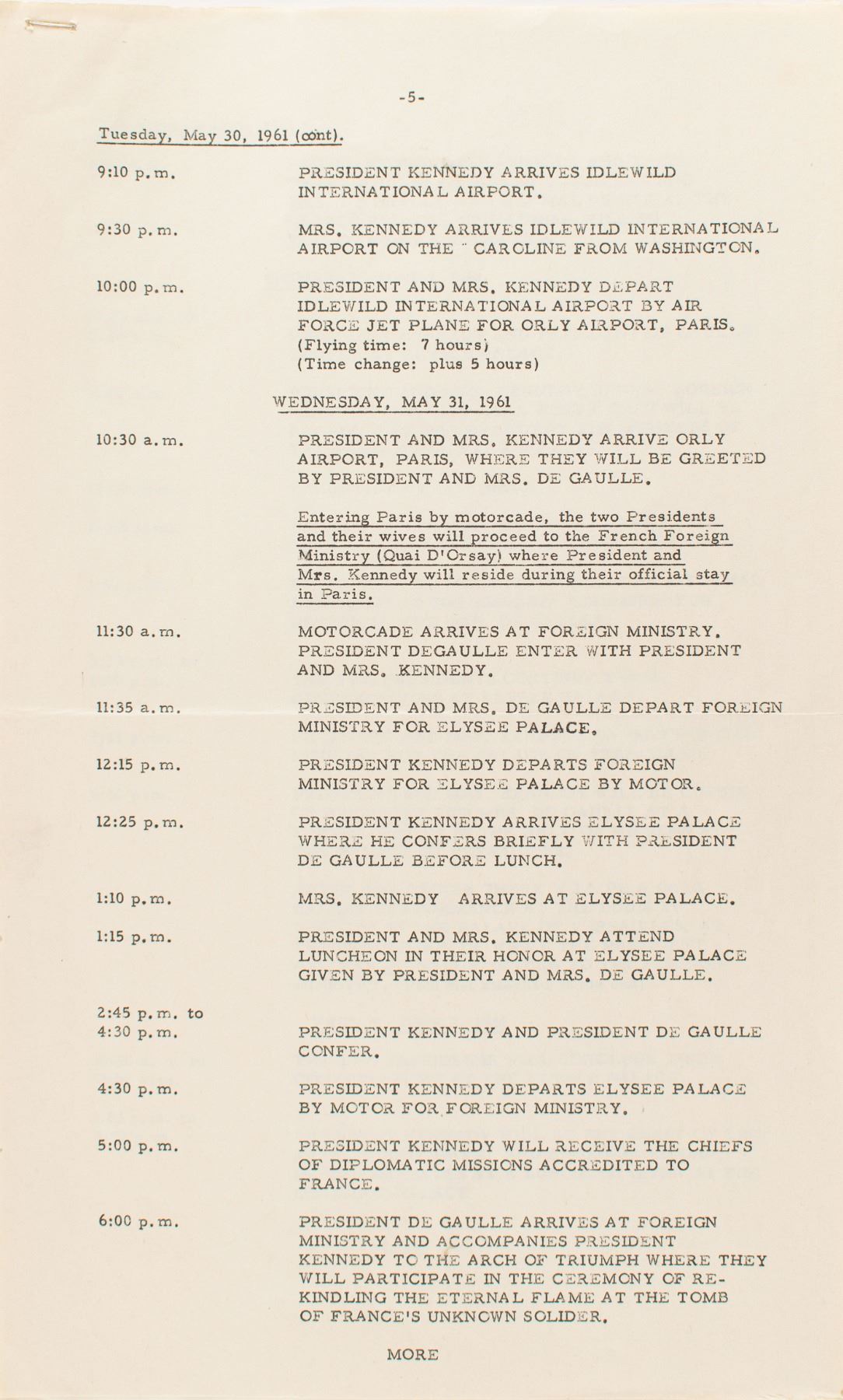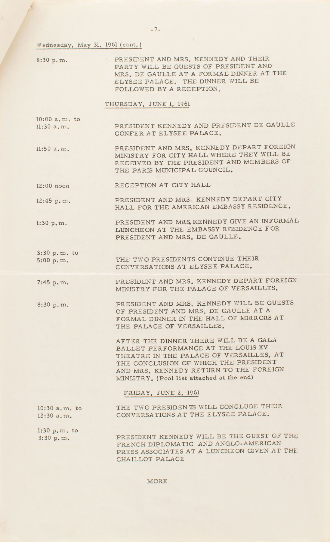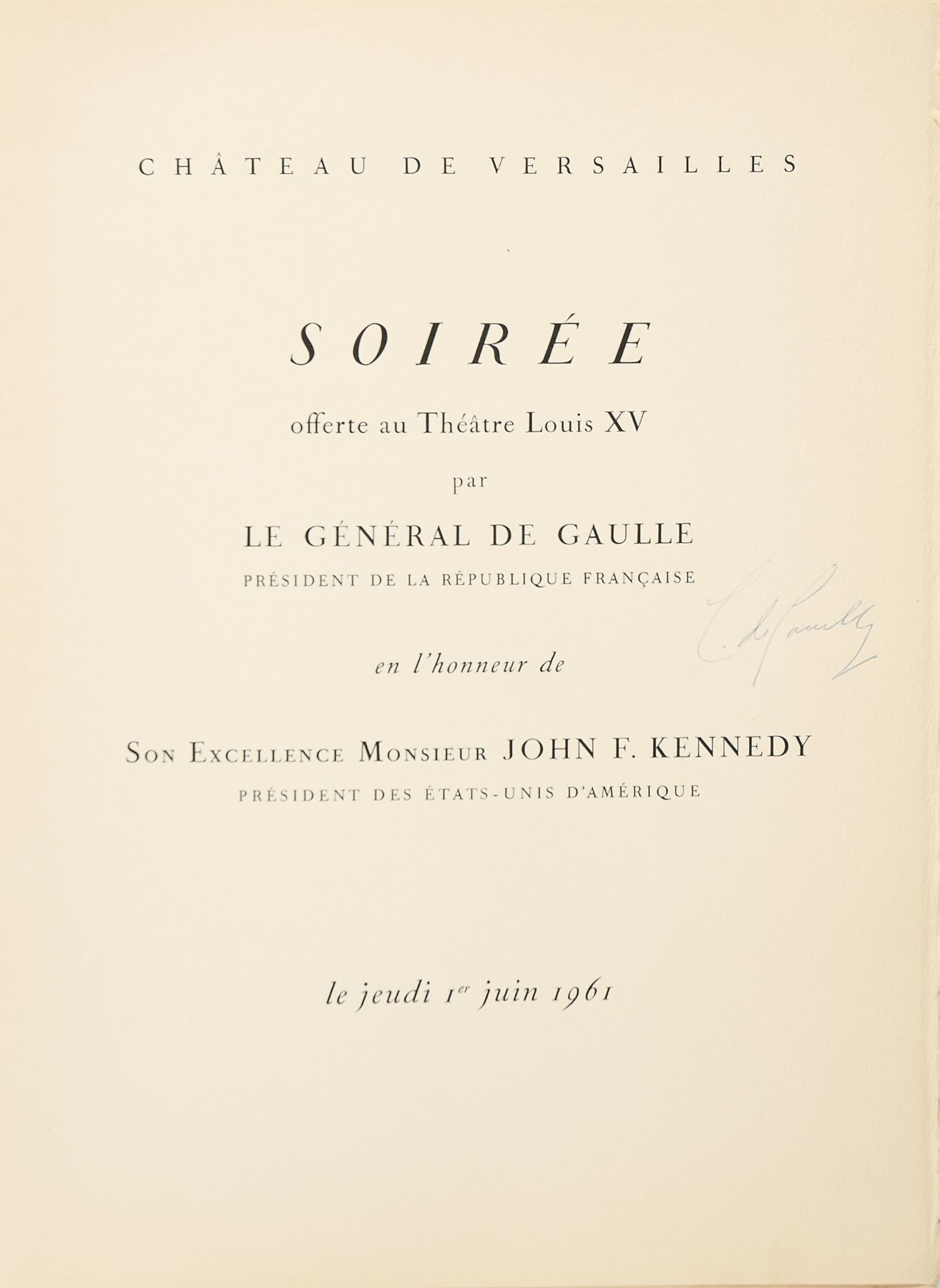 Jacqueline Kennedy's ballet program signed by French President Charles De Gaulle on the inside cover from June 1, 1961, when President Kennedy and Jacqueline were guests of the De Gaulle's at a formal dinner in the Hall of Mirrors at the Palace of Versailles. The Kennedys were entertained by a gala ballet performance at the Louis 15 Theatre in the Palace of Versailles. A beautiful hand-crafted program on special paper for the nights performances. Unique and ex. Robert White sale. The 11-page itinerary for the Kennedy's visit to France in 1961 accompanies this artifact.