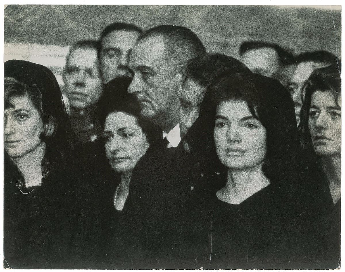 Somber vintage semi-glossy 14 x 11 photo of Jacqueline Kennedy and Lyndon B. Johnson attending services for the fallen president. In very good to fine condition, with edge wear and some creasing, and a slightly grainy quality to image.