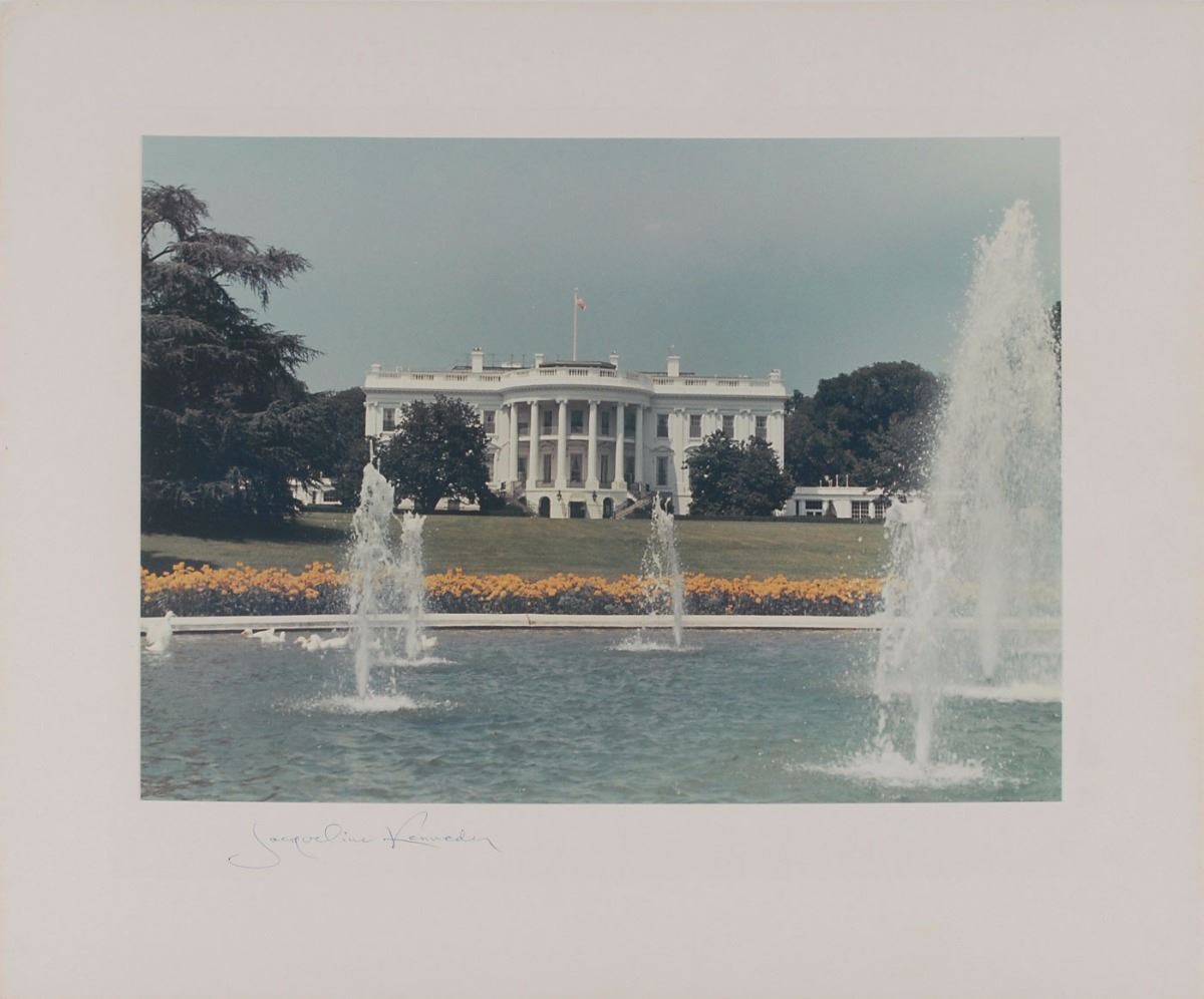 Scarce color matte-finish 13.25 x 9.75 photo of the White House affixed to its original 17.5 x 14.25 mount, signed on the mount in blue ballpoint, “Jacqueline Kennedy.” In fine condition. Commissioned by the Kennedys in 1961 to produce the Official White House Christmas Card, Hallmark President Joyce C. Hall took several photographs of the north lawn and its beautiful circular pool and water fountain; although this version was ultimately not used for the card, the Kennedys presented mounted copies of this photo as VIP gifts. An appealing oversized image of the White House, the historic landmark that Jackie devoted her time to restoring and preserving.