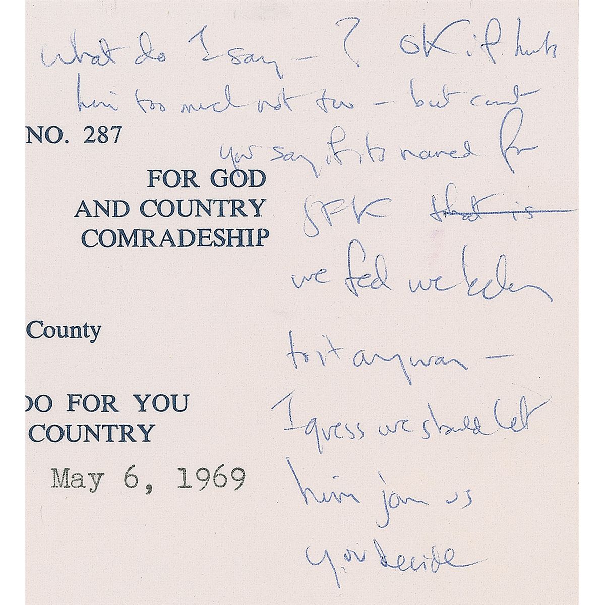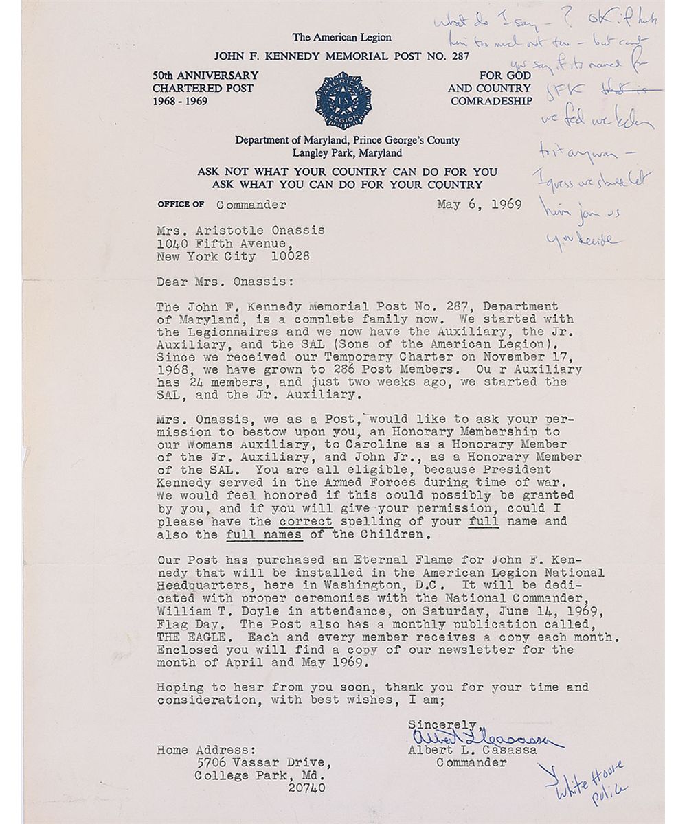 Two unsigned handwritten notes. The first is along the right edge of a 1969 TLS to Kennedy from American Legion commander Albert Casassa, on letterhead bearing John F. Kennedy’s memorable inauguration speech quote. The letter asks for, “permission to bestow upon you, an Honorary Membership to our Woman’s Auxiliary, to Caroline as an Honorary Member of the Jr. Auxiliary, and John Jr., as a Honorary Member of the SAL [Sons of the American Legion]. You are all eligible, because President Kennedy served in the Armed Forces during time of war.” Kennedy writes a note to David Powers at the top which reads, “What do I say? OK if hurts him too much not too—but can’t you say if it’s named for JFK that is we feel we belong to it anyway—I guess we should let him join us you decide.” The second unrelated note is to her personal secretary, Nancy Tuckerman, on a 5.75 x 3.5 off-white sheet, reading, “Nancy—what is most tactful answer—I don’t mind getting them & seeing them if it isn’t imposing.” In fine condition, with creasing to typed letter.