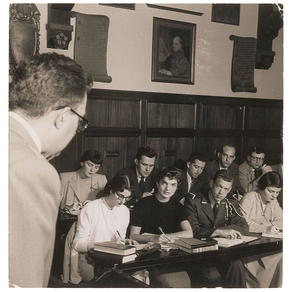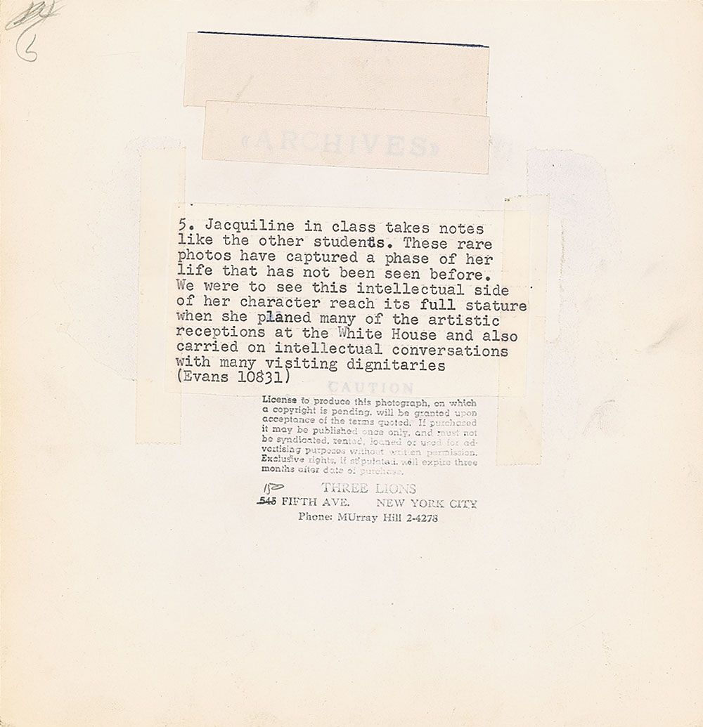 Original first-generation glossy 7.75 x 8 photo of Jackie taking notes during a political science class at Georgetown, where the other students aspired to careers in government. Reverse of photo bears a Three Lions Inc. stamp and affixed caption. In fine condition, with creasing to corner tips. According to the McCall’s article that published Suero’s photos, Jackie was ‘a remarkably good student. No nonsense about cutting classes because a diplomatic reception kept her out late the night before.’ A rare look at the young woman among her peers, adding the book-smarts to her personal experiences in the world of politics, which her classmates could only dream to learn. Published in Camelot at Dawn, Johns Hopkins University Press, 2001.