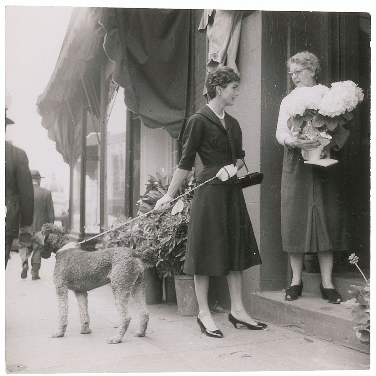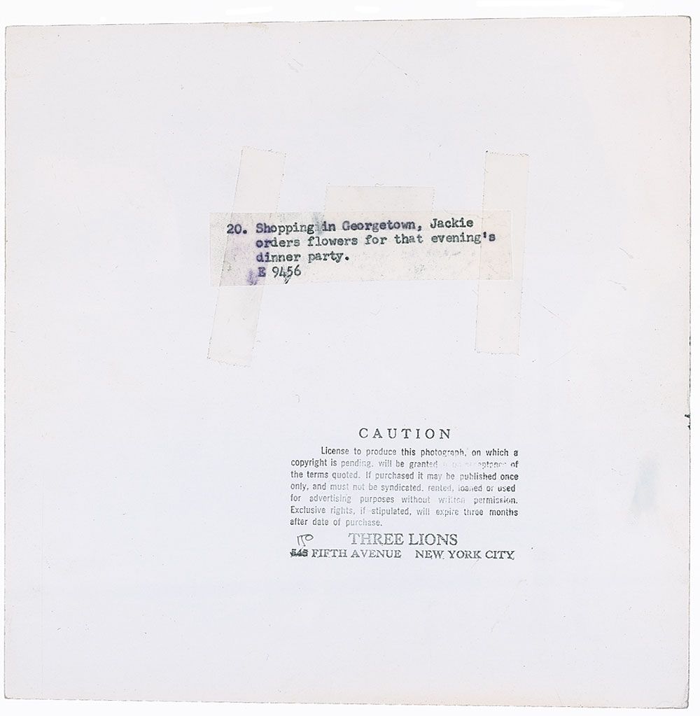 Original first-generation 7.75 x 7.75 glossy photo of Jackie socializing with a florist in Georgetown, while her poodle strains against his leash as people walk by. Reverse of photo bears a Three Lions Inc. stamp and an affixed typed caption. In fine condition. Published in Camelot at Dawn, Johns Hopkins University Press, 2001. Photo rights: The Lowenherz Collection of Kennedy Photographs, Friedheim Library and Archives, the Peabody Institute of The Johns Hopkins University, Orlando Suero, photographer.