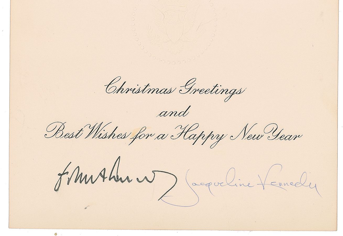Highly desirable official White House Christmas card from 1962, 6.75 x 5.75, signed inside in blue ballpoint by Jacqueline Kennedy; the John F. Kennedy signature is secretarial. Printed below an embossed presidential seal are holiday greetings: "Christmas Greetings and Best Wishes for a Happy New Year." In very good to fine condition, with toning to the front of the card.