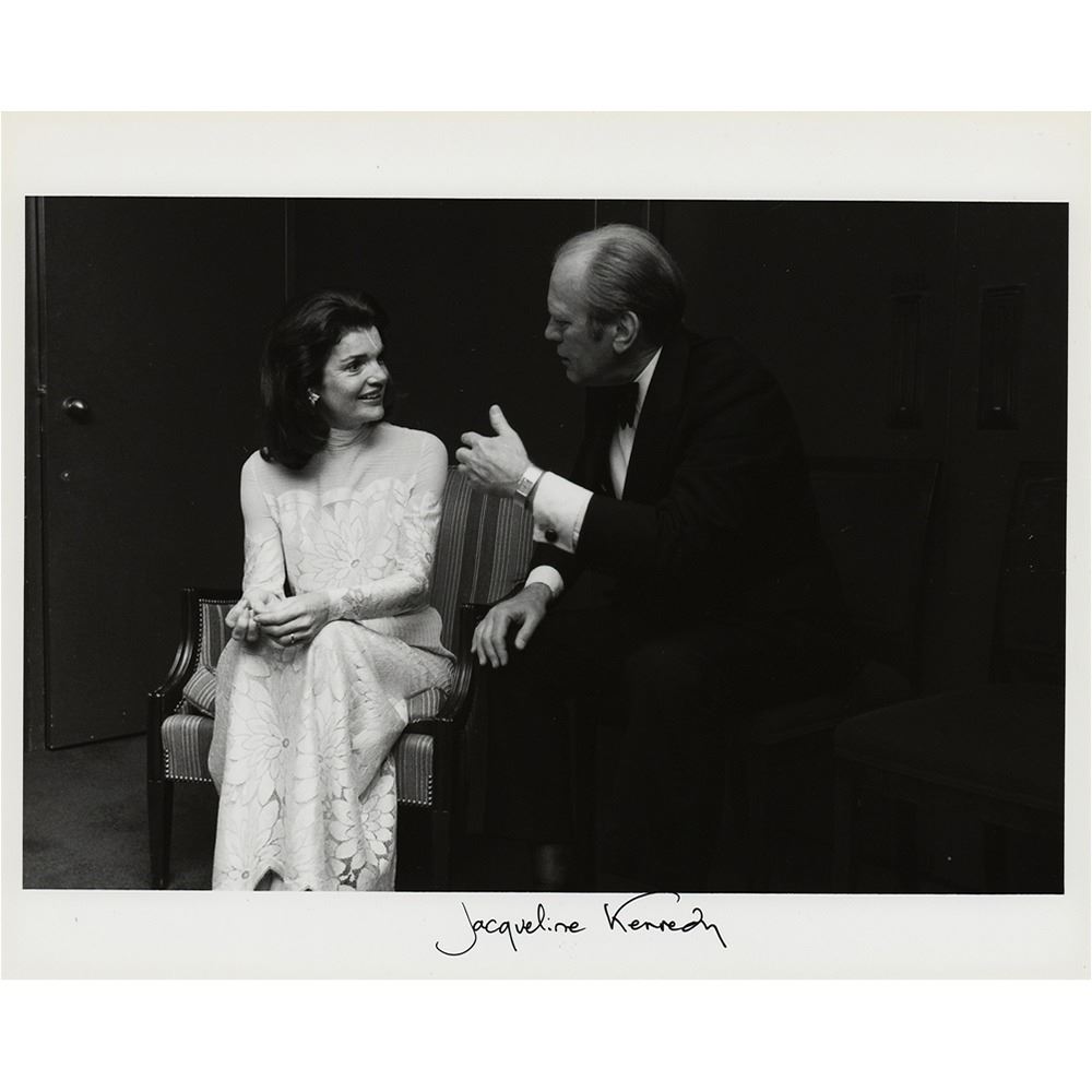 Nice glossy 10 x 8 photo of Kennedy seated with Gerald R. Ford, signed in the lower border in black felt tip, "Jacqueline Kennedy." In fine condition.