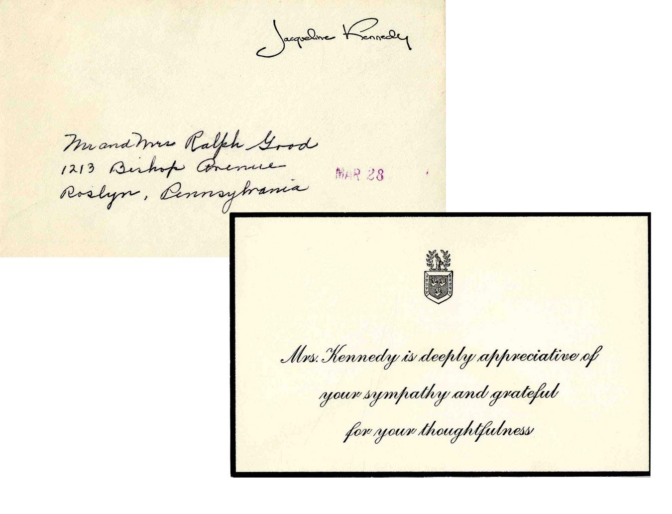 Official 5.25" x 3.25" Thank You Card Sent by First Lady Jacqueline Kennedy After JFK's Assassination -- With Original Envelope -- Fine