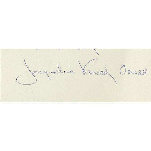 <B>Jacqueline Kennedy Writes About the JFK Library</B></I> TLS: "<I>Most Sincerely/Jacqueline Kennedy Onassis,</B></I>" 1p, 5.5" x 9". New York, February 3, 1973. To David E. Bell, The Ford Foundation. In full: "<I>It is with the deepest appreciation that I write thanking you for the time and effort you have devoted to the oral history interviews for the John F. Kennedy Library. Your contribution will--in future years--be of the utmost importance to those compiling a history of President Kennedy's administration, and I shall always be grateful to you for the part you played in this project.</B></I>" "<I>Dear Mr Bell</B></I>" is handwritten by Mrs. Onassis in the salutation. David E. Bell served under Presidents Kennedy and Johnson as Administrator of the USAID program (1963-1966) and was Executive Vice President of the Ford Foundation from 1966-1981. The John F. Kennedy Library Archives includes oral history interviews with over 1,300 people. Mrs. Onassis' signature in full as "Jacqueline Kennedy Onassis" is rare and desirable, as are her letters mentioning President Kennedy. Paper clip indent at upper left edge, else in very fine condition.