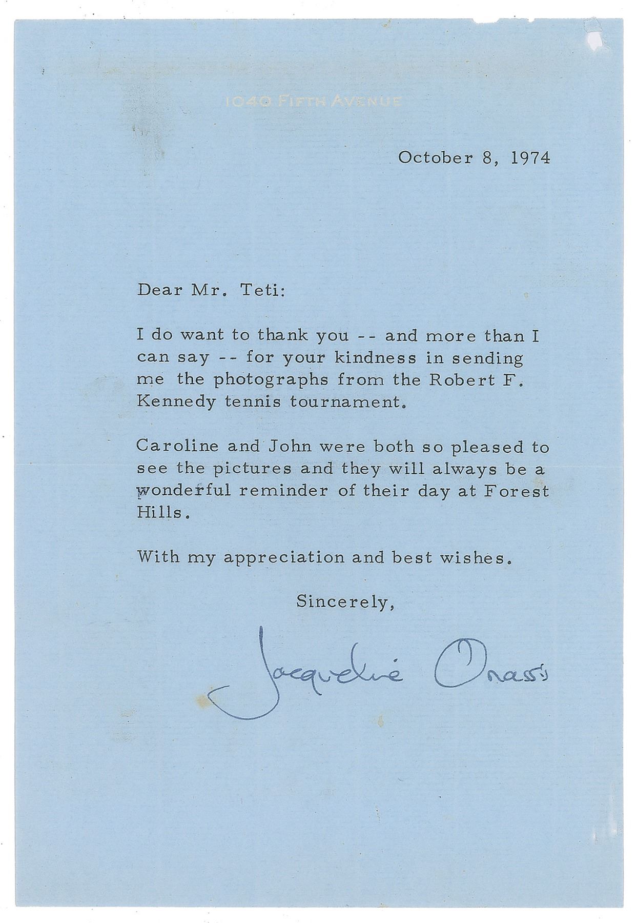 TLS signed “Jacqueline Onassis,” one page, 5 x 7.5, personal letterhead, October 8, 1974. Letter to "Mr. Teti," in part: "I do want to thank you—and more than I can say—for your kindness in sending me the photographs from the Robert F. Kennedy tennis tournament. Caroline and John were both so pleased to see the pictures and they will always be a wonderful reminder of their days at Forest Hills." In very good to fine condition, with some light staining, and a small hole, to the top.