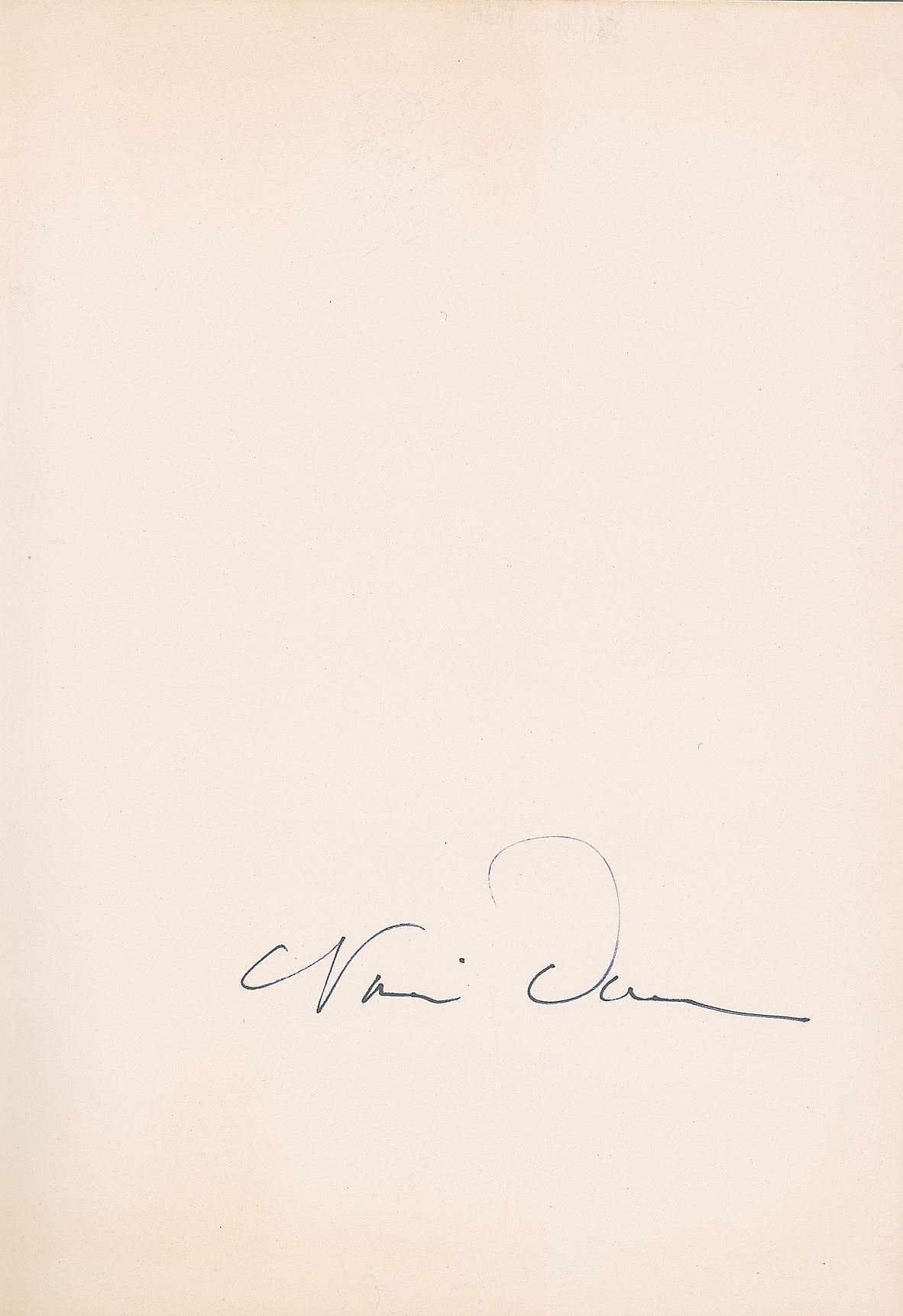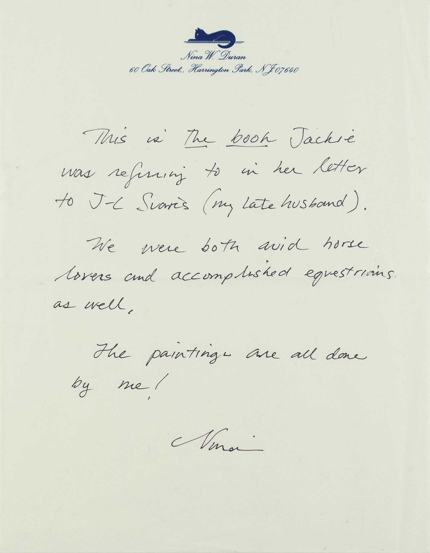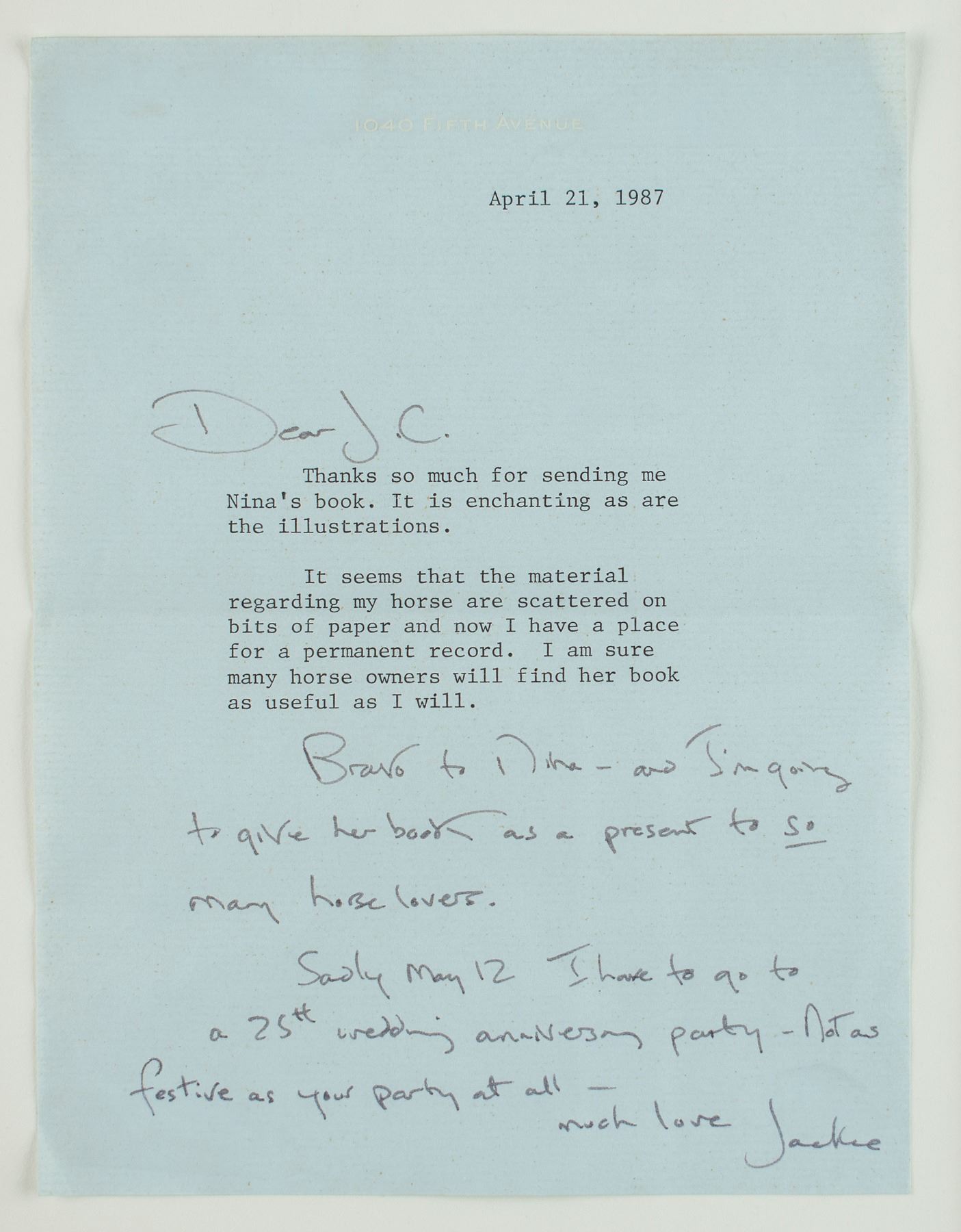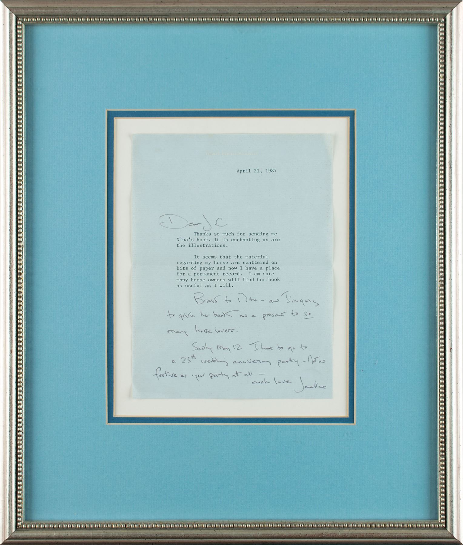 TLS signed “Jackie,” one page, 5.75 x 7.75, personal letterhead, April 21, 1987. Letter to "J. C.," in full: "Thanks so much for sending me Nina's book. It is enchanting as are the illustrations. It seems that the material regarding my horse are scattered on bits of paper and now I have a place for a permanent record. I am sure many horse owners will find her book as useful as I will." She adds a handwritten postscript: "Bravo to Nina—and I'm going to give her book as a present to so many horse lovers. Sadly May 12 I have to go to a 25th wedding anniversary party—not as festive as your party at all." Mounted double-matted, and framed to an overall size of 13.5 x 15.5. In very good to fine condition, with scattered light creasing. Accompanied by a hardcover edition of A Rider's Diary by Nina Duran, signed on the first free end page in black felt tip by Duran; also includes an ALS by Duran, in part: "This is the book Jackie was referring to in her letter to J. C. Suares (my late husband). We were both avid horse lovers and accomplished equestrians."