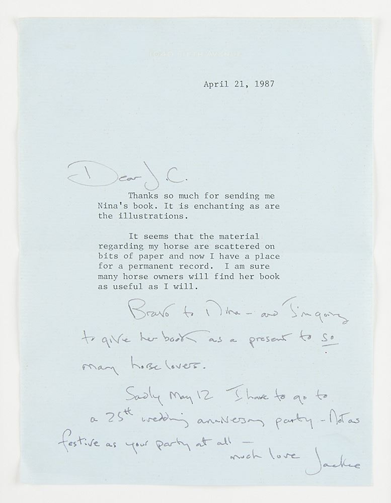 TLS signed "Jackie," one page, 5.75 x 7.75, personal letterhead, April 21, 1987. Letter to "J. C.," in full: "Thanks so much for sending me Nina's book. It is enchanting as are the illustrations. It seems that the material regarding my horse are scattered on bits of paper and now I have a place for a permanent record. I am sure many horse owners will find her book as useful as I will." She adds a handwritten postscript: "Bravo to Nina--and I'm going to give her book as a present to so many horse lovers. Sadly May 12 I have to go to a 25th wedding anniversary party--not as festive as your party at all." Mounted double-matted, and framed to an overall size of 13.5 x 15.5. In very good to fine condition, with scattered light creasing.