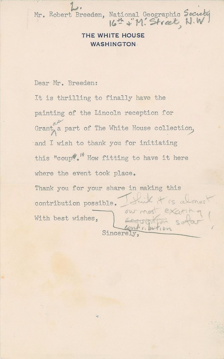 Typed draft of a letter with handwritten emendations in pencil, one page, 5 x 8, no date. Letter to Robert L. Breeden of the National Geographic Society. In full: “It is thrilling to finally have the painting of the Lincoln reception for Grant as a part of The White House collection, and I wish to thank you for initiating this ‘coup.’ How fitting to have it here where the event took place. Thank you for your share in making this contribution possible.” At the end, Jackie writes a final sentence in pencil, “I think it is almost our most exciting acquisition so far!” In fine condition. Jackie’s primary project as first lady was the restoration of the White House to reflect its historic past, and in doing so she solicited donations of important material and artifacts from various organizations.