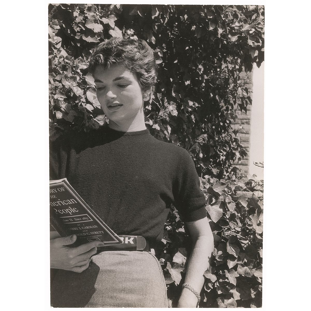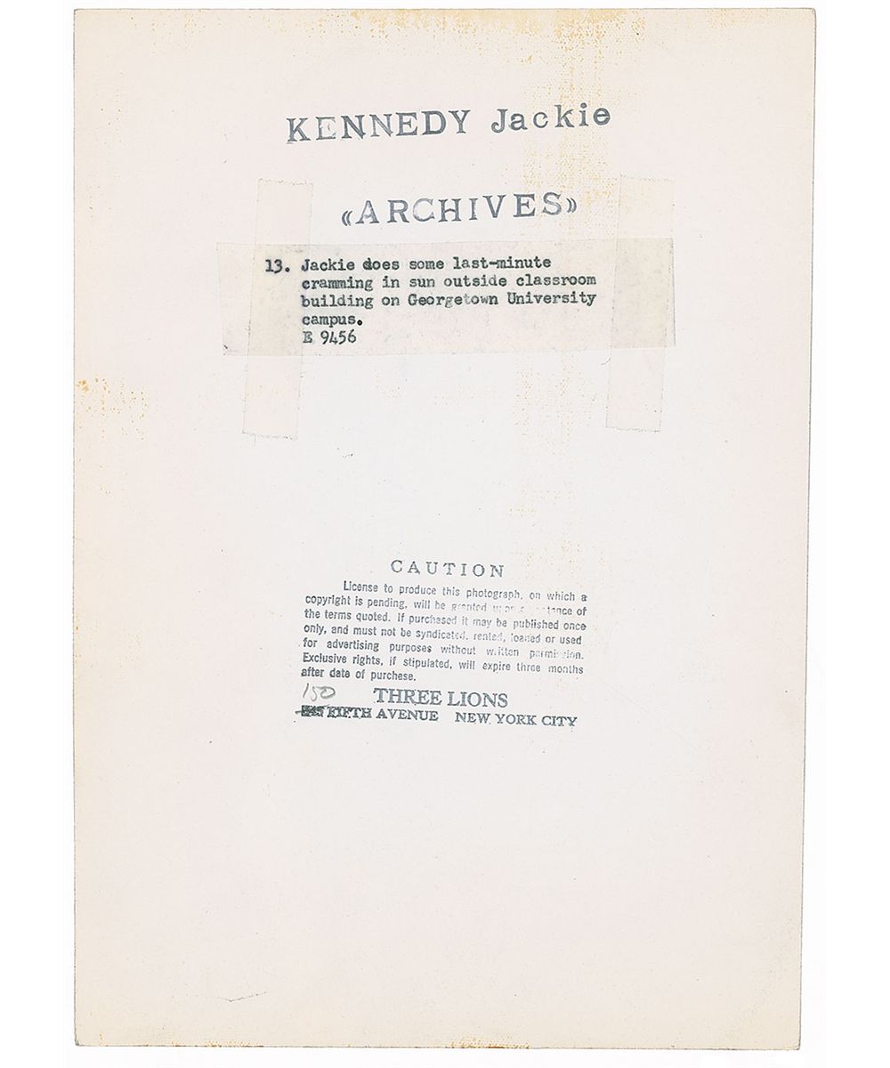 Original first-generation 6.75 x 9.5 glossy photo of Jackie reading from The History of the American People outside on the Georgetown University campus. Reverse of photo bears a Three Lions Inc. stamp and an affixed typed caption. In fine condition. Published in Camelot at Dawn, Johns Hopkins University Press, 2001. Photo rights: The Lowenherz Collection of Kennedy Photographs, Friedheim Library and Archives, the Peabody Institute of The Johns Hopkins University, Orlando Suero, photographer.