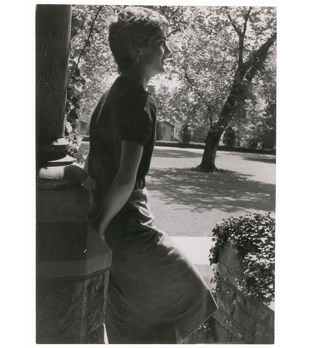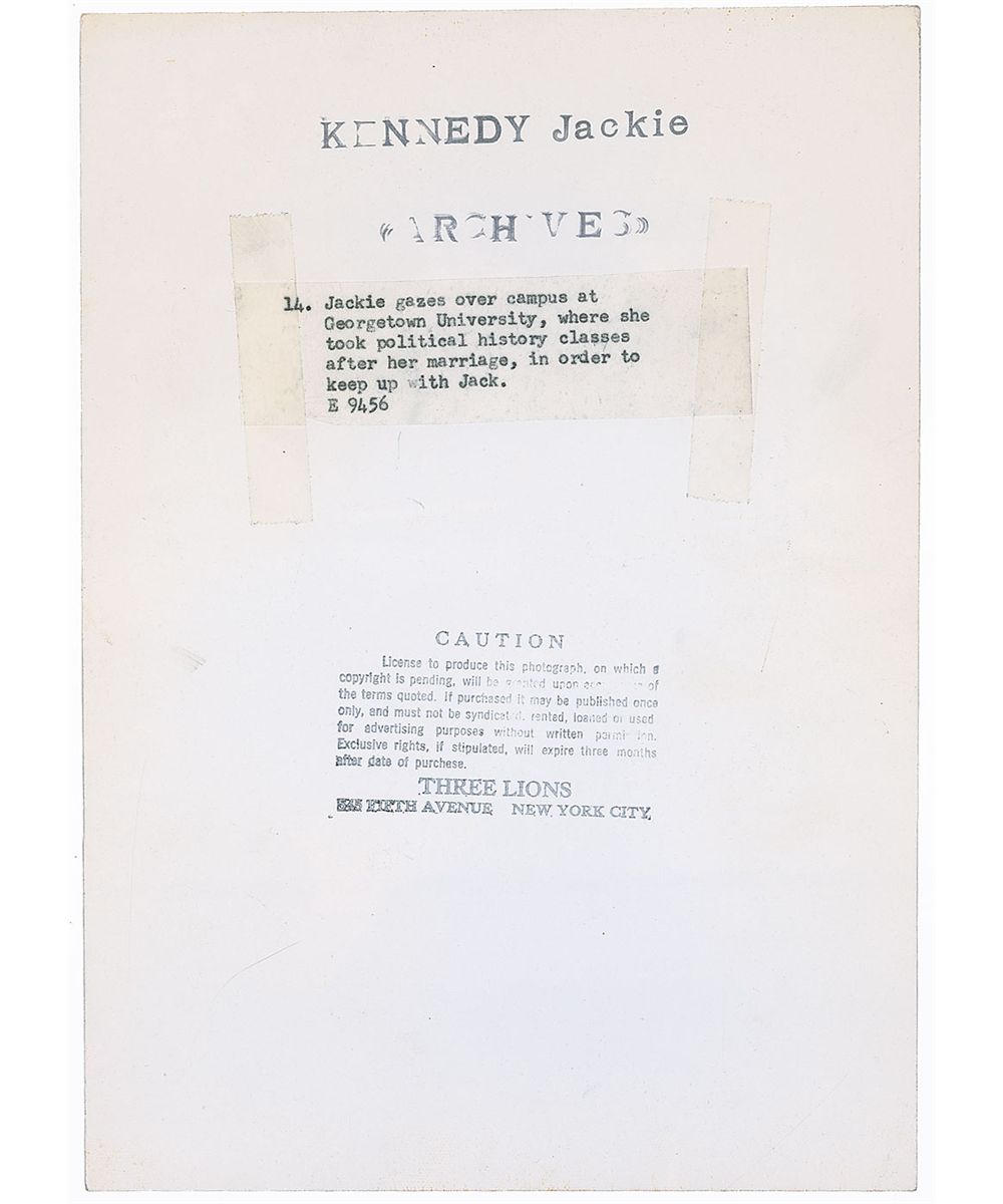 Original first-generation 6.75 x 9.5 glossy photo of Jackie looking across the campus of Georgetown University. Reverse of photo bears a Three Lions Inc. stamp and an affixed typed caption. In fine condition, with a few minor edge creases. Photo rights: The Lowenherz Collection of Kennedy Photographs, Friedheim Library and Archives, the Peabody Institute of The Johns Hopkins University, Orlando Suero, photographer.