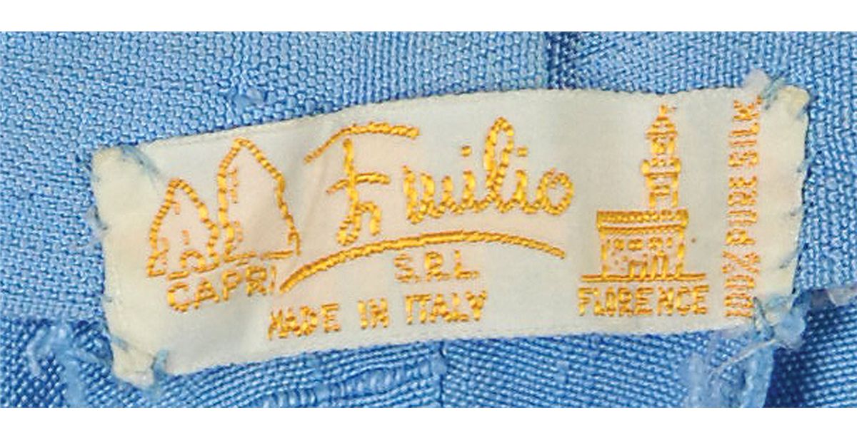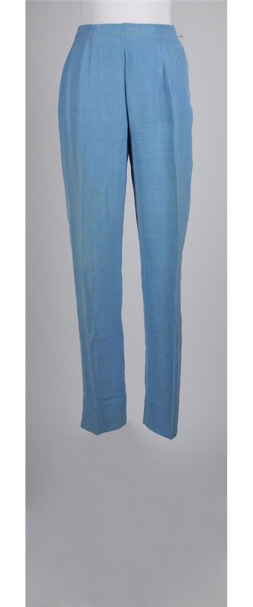 Kennedy’s personally-owned and -worn slacks. Teal blue textured silk slacks, size 12, with side zipper and one button closure, bear an “Emilio S.R.L. Made in Italy Capri-Florence” maker’s label. In fine condition, with discoloration at waist band, and a small stain on right leg at knee level. Accompanied by a copy of a certificate of authenticity from Mary Gallagher, Kennedy’s personal secretary. Provenance: Robert L. White Collection, Guernsey’s, 2005.