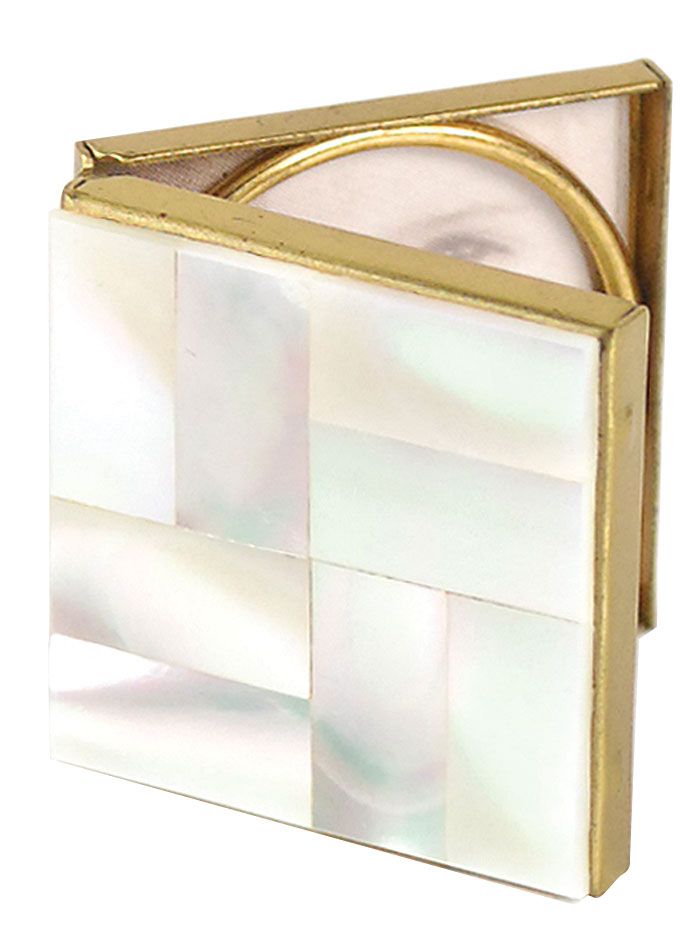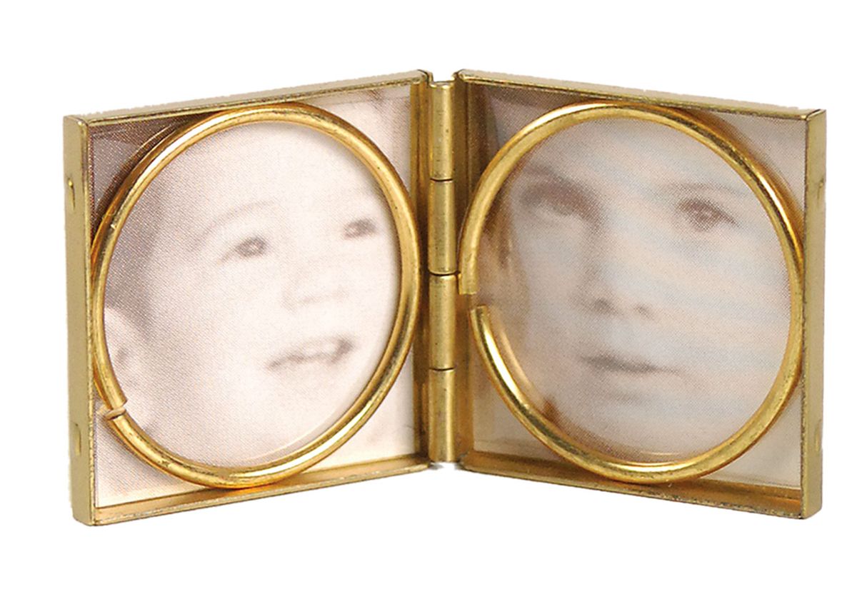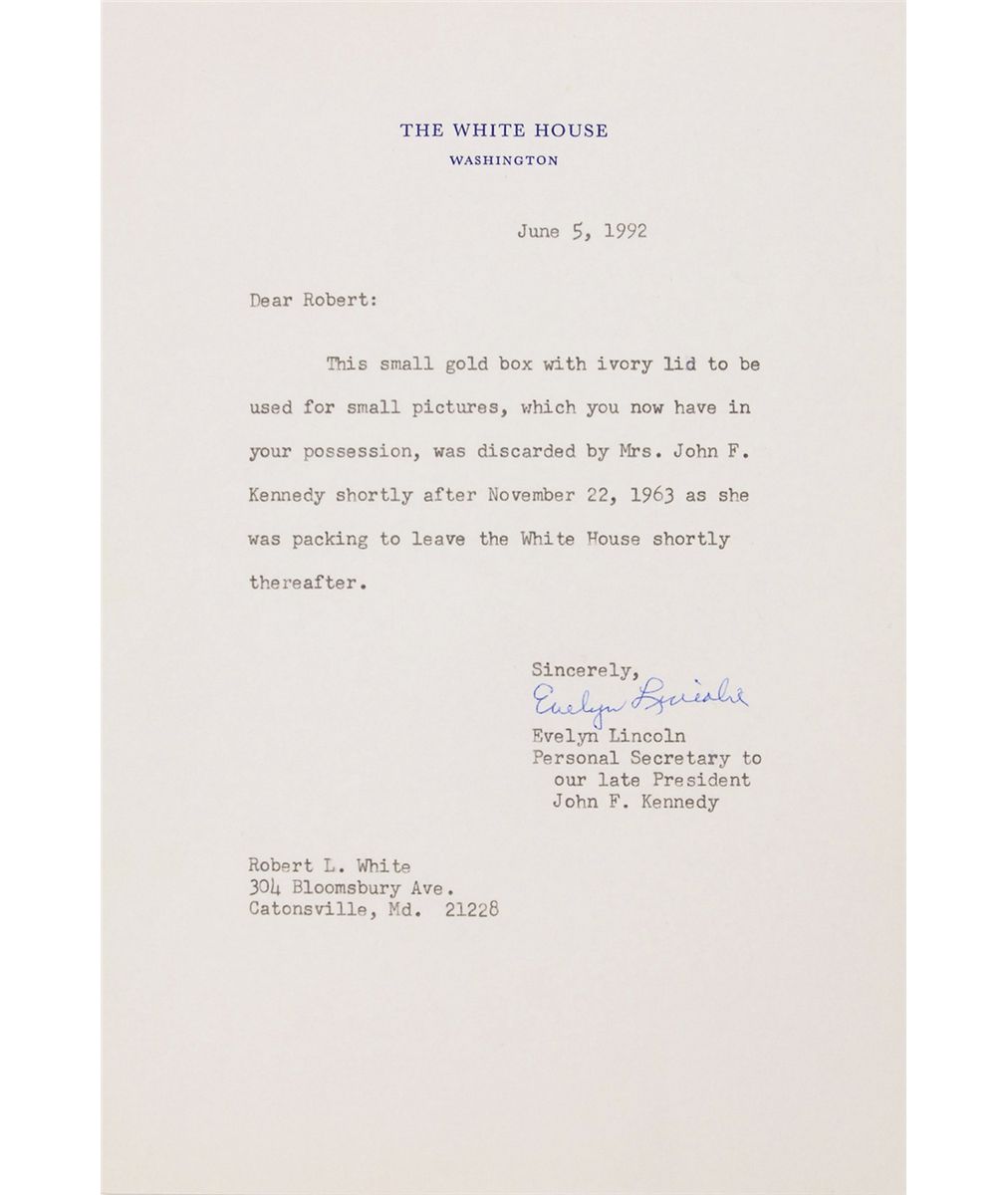 Jacqueline Kennedy’s personally-owned small gold and mother-of-pearl photo case. Case has an opalescent cover, measures 1.25 x 1.25 closed, and opens to a size of 2.5 x 1.25, with two reproduction photos of John, Jr. and Caroline Kennedy inside, which slide under a gold metal rim and a plastic insert. Mrs. Kennedy used this to carry photos of her children, keeping it at the White House and sometimes in her purse. Accompanied by a 1992 letter of provenance from Evelyn Lincoln, which reads, “This small gold box with ivory lid to be used for small pictures…was discarded by Mrs. John F. Kennedy shortly after November 22, 1963 as she was packing to leave the White House shortly thereafter.” In fine condition. A very personal memento kept close to Jackie. Provenance: The Robert L. White Collection; Guernsey’s, 2005.