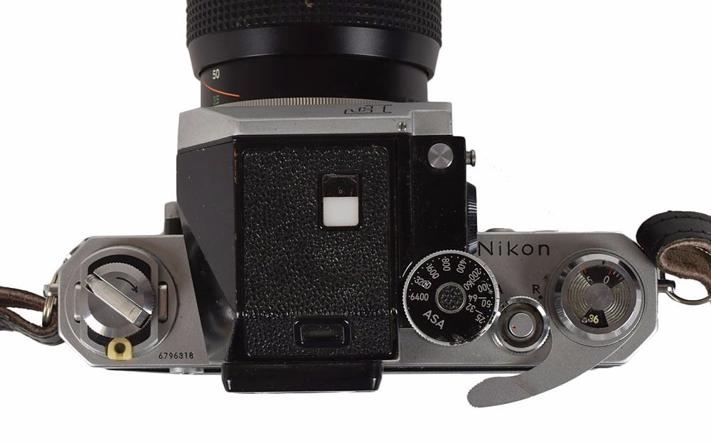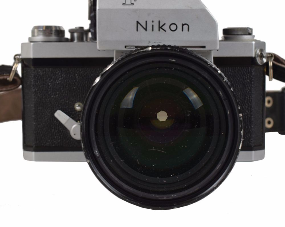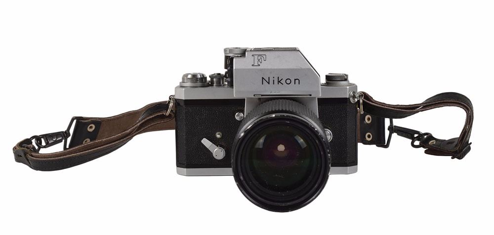 Jacqueline Kennedy's personally-owned and -used Nikon F single-lens reflex, manual focus camera, serial no. 6796318, fitted with a Nikkor 35–135mm 1:3.5–4.5 zoom lens and leather strap. The serial number dates the camera to between December 1966 and March 1967. In fine cosmetic condition; working condition unknown. Provenance: Sotheby's, February 2005 Kennedy Homes Auction; ex. The Frank Harvey Kennedy Collection. Accompanied by copies of the Sotheby's invoice and several images of Kennedy holding various types of cameras.