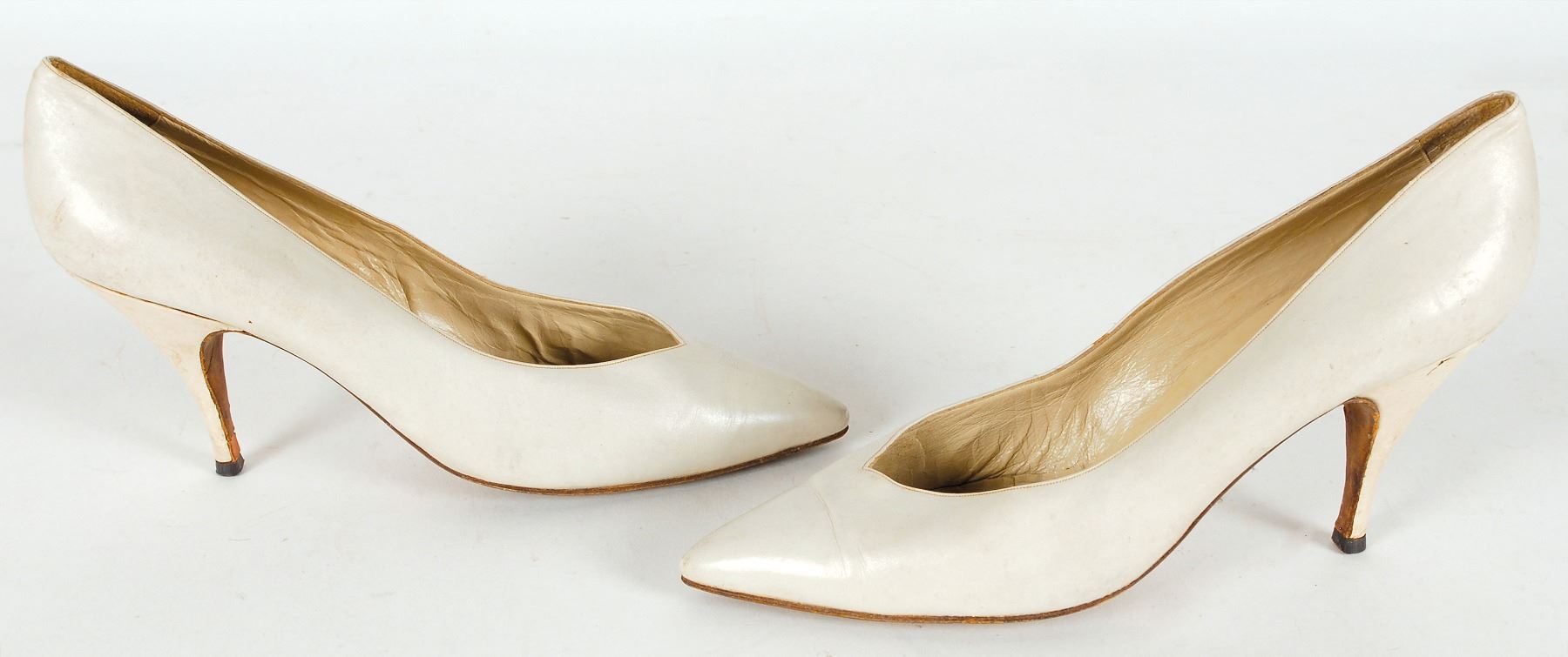 Jacqueline Kennedy's personally-owned and -worn pair of cream-colored high-heeled designer shoes with supple leather uppers and brown leather soles, with labels on both insoles imprinted in gilt, "Ferrario e C., San Vittore Olona, Italy." The tags also list the cities of Brussels, Berlin, Paris, New York, Amsterdam, and London. Both are stamped on the soles as size "40" and "Made in Italy." The shoes measure 10? long and 6? tall at their highest point. In very good condition, with expected general wear from frequent use. Accompanied by a letter of provenance tracing the history of these shoes, stating that they were originally given to White House limo driver John J. 'Muggsy' O'Leary. Muggsy later gave them to his friend, the manager of a Capitol Hill bookstore called Trover Shop, who passed them down through her family; they were then sold by a niece in 2014.