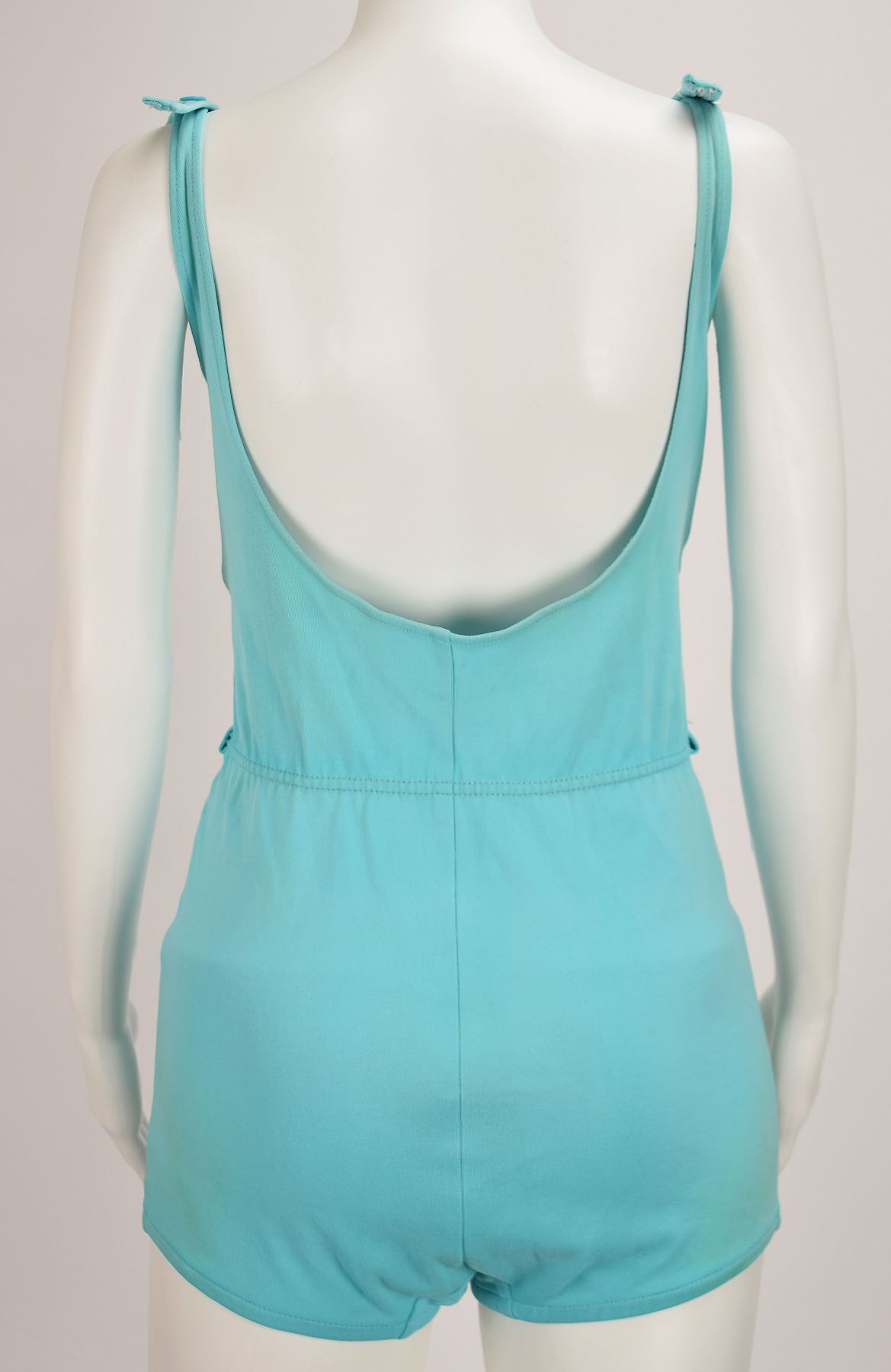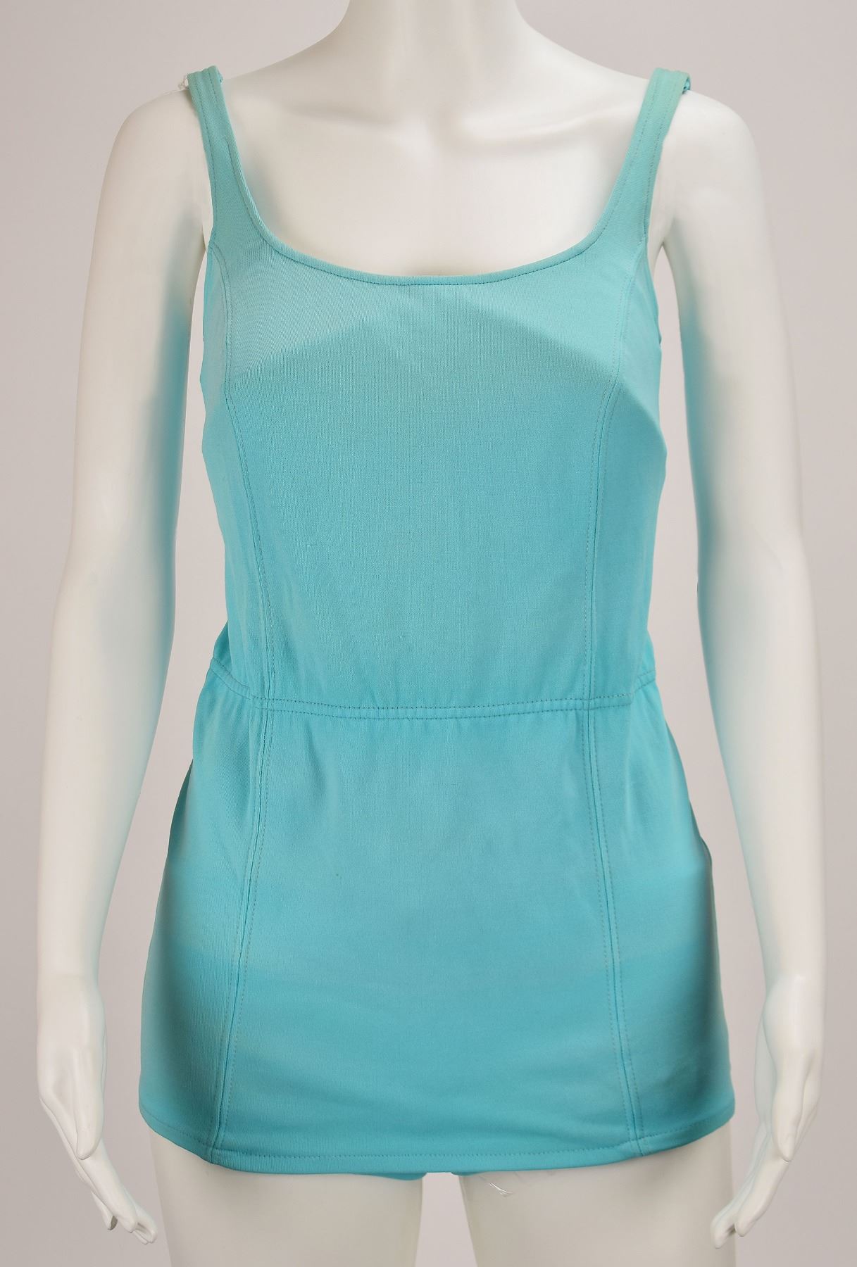 First Lady Jacqueline Kennedy's turquoise blue Catalina one-piece swimsuit, recovered from the presidential yacht 'Honey Fitz' by Lieutenant Henry E. Hirschy, Jr. The bathing suit features double-button shoulder straps and a built-in bra, with the Catalina maker's tag at center. A bright piece of swimwear, this is an excellent example of Jackie's taste in fashion that resulted in her world-famous wardrobe. In fine condition.