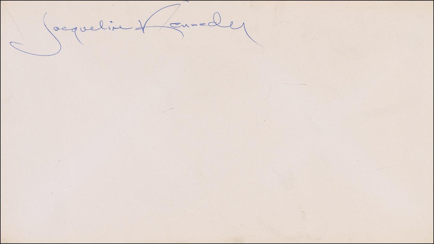 Ballpoint signature, “Jacqueline Kennedy,” at the top left corner of an off-white 6.5 x 3.5 envelope. In fine condition, with surface impressions and edge toning.