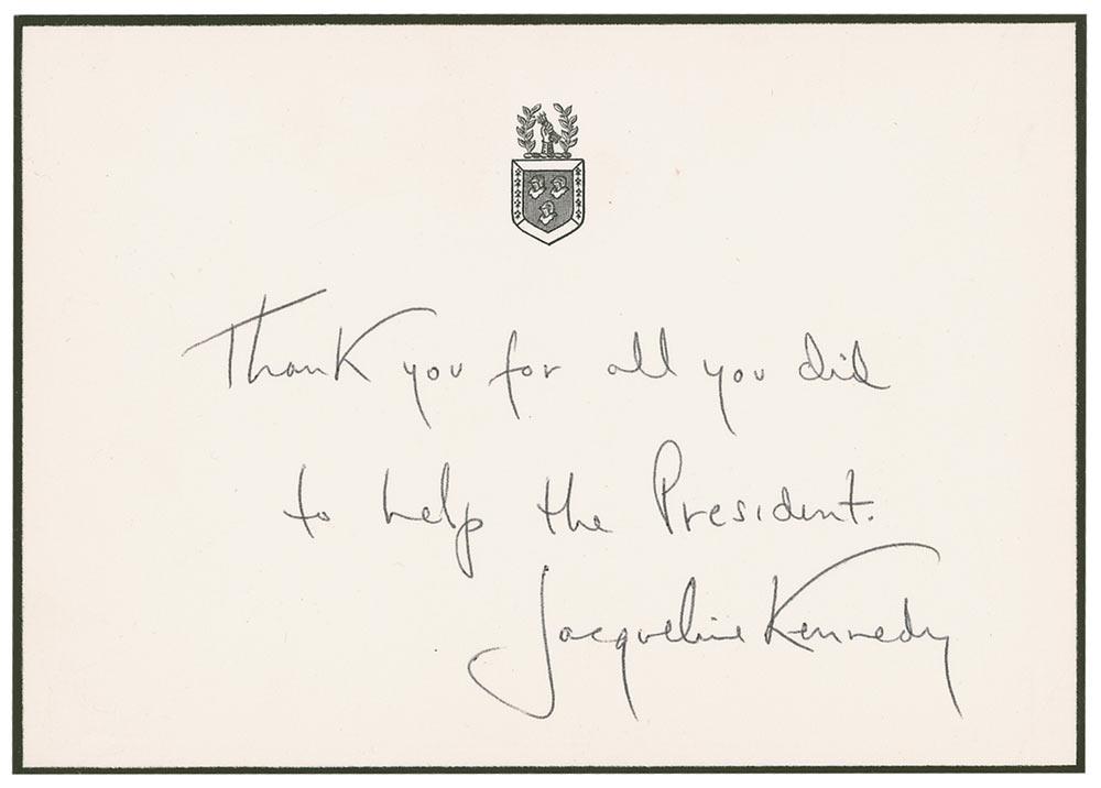 ANS, one page, 5.25 x 3.5, black-bordered letterhead, no date. Brief note of thanks to an unidentified recipient. In full: “Thank you for all you did to help the President.” In very fine condition. Accompanied by the original transmittal envelope and a black-bordered mass card.