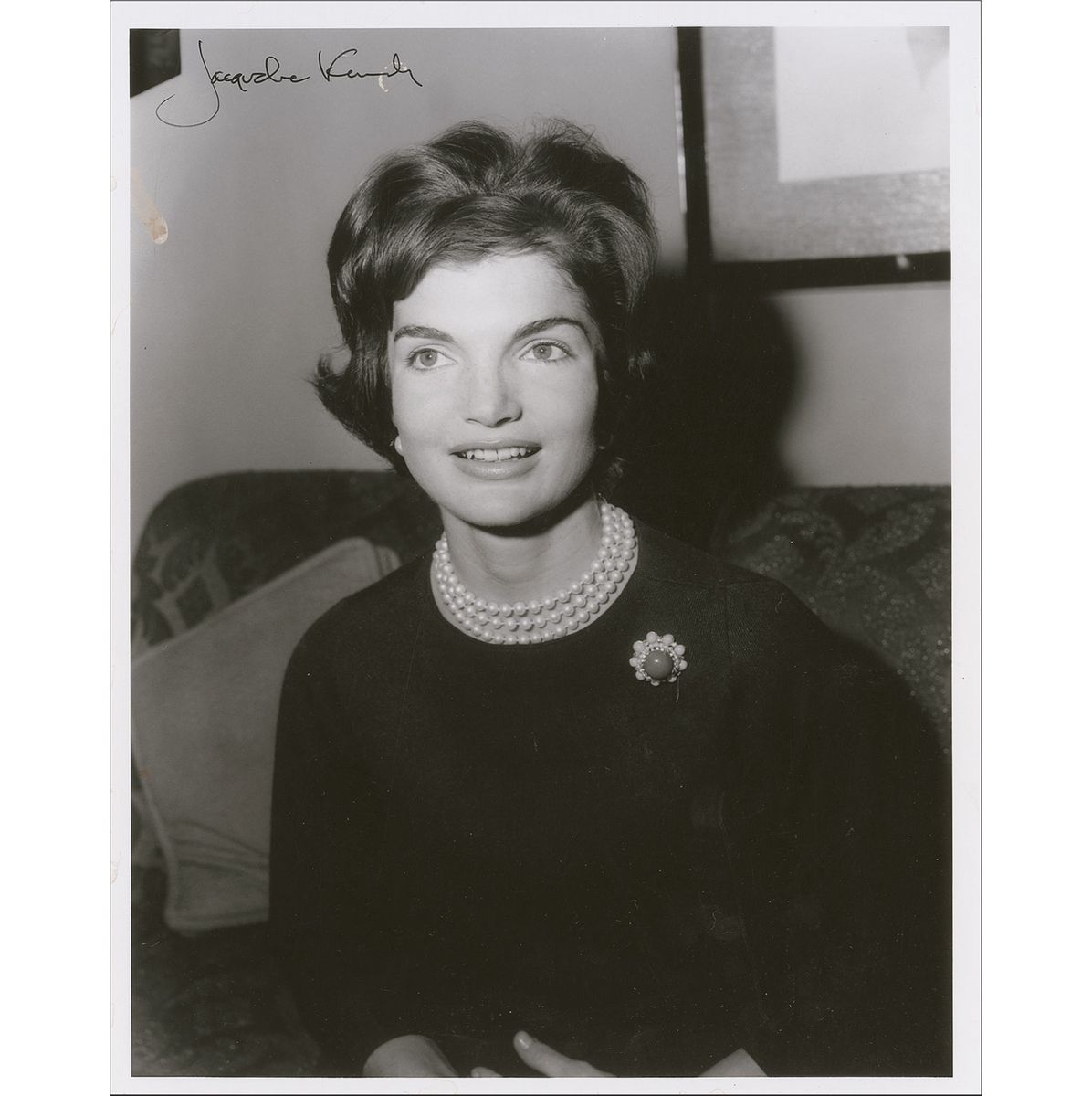 Glossy 8 x 10 photo of a young Jackie in a black dress and pearls, signed in black felt tip. In fine condition, with a couple small spots of light staining inherent to the original photo, including a bit under signature.