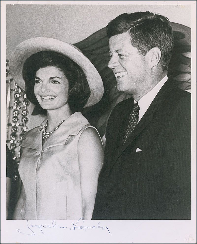 Matte-finish 8 x 10 photo of John and Jackie Kennedy, signed in the lower border in blue ballpoint. In very good condition, with creasing and small tears to top edge, some other scattered light creases and bends, as well as some light silvering to darker areas of image.