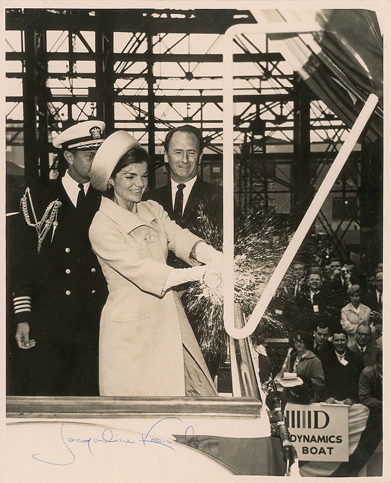 Glossy 8 x 9.75 General Dynamics photo of Kennedy commissioning a General Dynamics vessel with a bottle of champagne, signed in blue ballpoint. Scattered edge creases, and some mild silvering, visible only at an angle, otherwise fine condition.