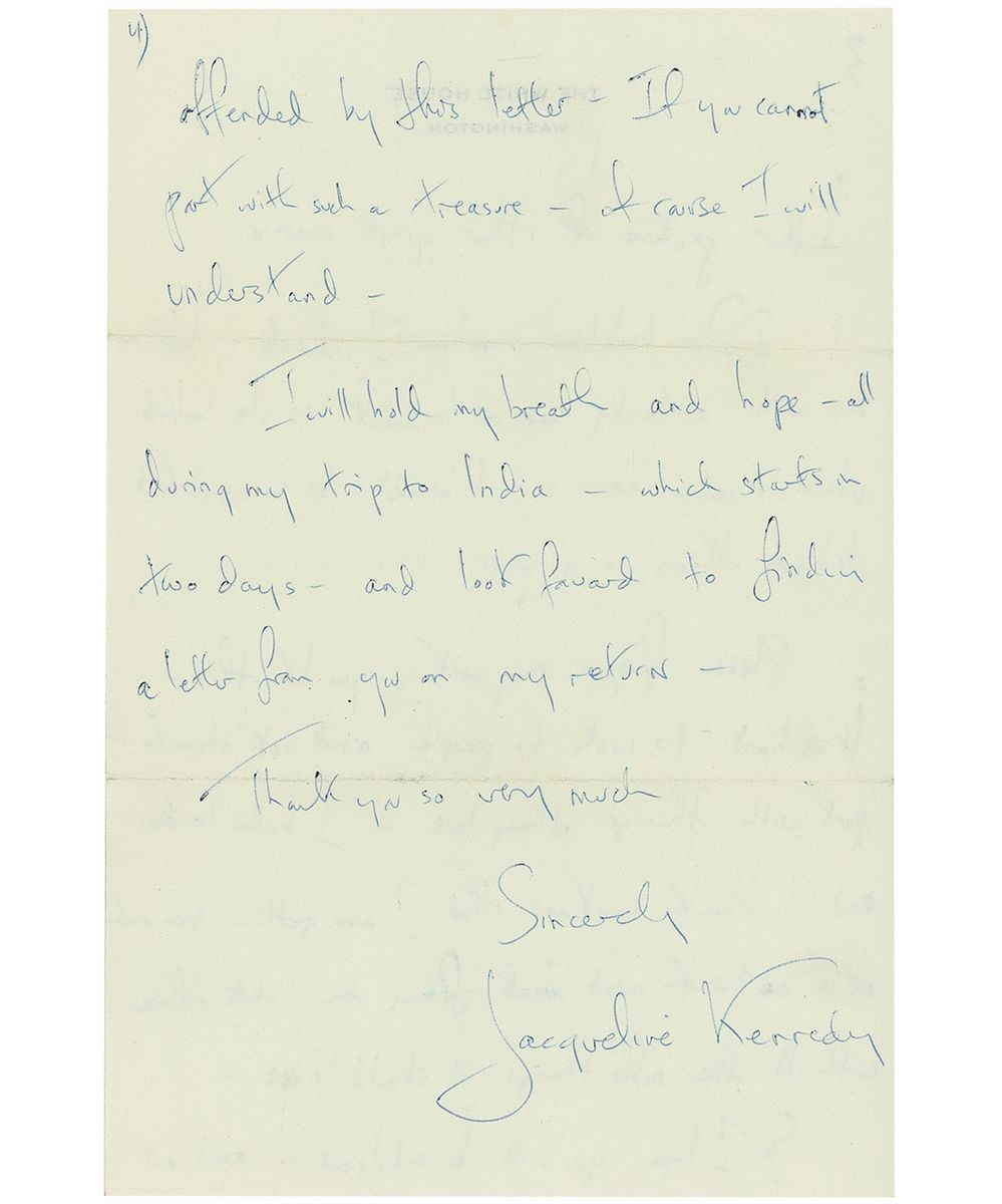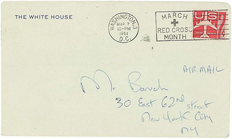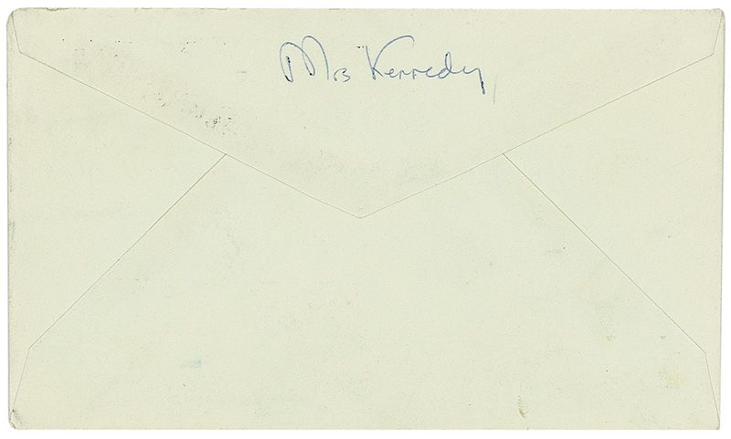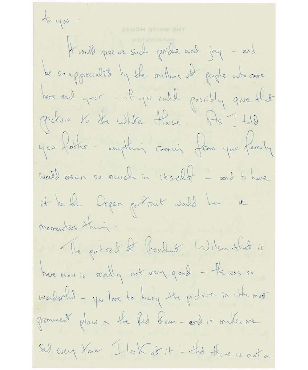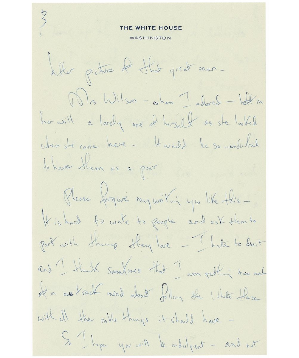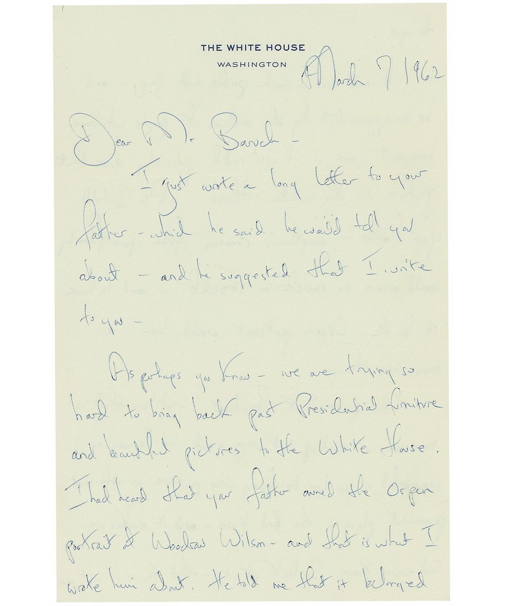 ALS, two pages both sides, 6 x 9.25, White House letterhead, March 7, 1962. Letter to Bernard Baruch, Jr., In part: “As perhaps you know—we are trying so hard to bring back the Presidential furniture and beautiful pictures to the White House. I heard that your father owned the Orpen portrait of Woodrow Wilson…He told me that it belonged to you. It would give us such pride and joy—and be so appreciated by the millions of people who come here each year—if you could possibly give that picture to the White House…to have the Orpen portrait would be a momentous thing. The portrait of President Wilson that is here now is not very good—He was so wonderful—you love to hang the picture in the most prominent place in the Red Room—and it makes me sad every time I look at it—that there is not a better picture of that great man…Please forgive me writing you like this—It is hard to write to people and ask them to part with things they love—I hate to do it and I think sometimes that I am getting too much of a one track mind about filling the White House with all the noble things it should have…If you cannot part with such a treasure—of course I will understand.” In fine condition. Accompanied by the original mailing envelope, addressed in Kennedy’s hand, and signed on the reverse, “Mrs. Kennedy.” In 1919, shortly after the end of the First World War, President Wilson traveled to France to participate in the Paris Peace Conference. He also had his portrait painted by the Irish artist Sir William Orpen, one of Britain’s official war painters. It appears Mrs. Kennedy was successful, as Wilson’s portrait now hangs in the White House, gifted by Baruch, Jr., in memory of his father.