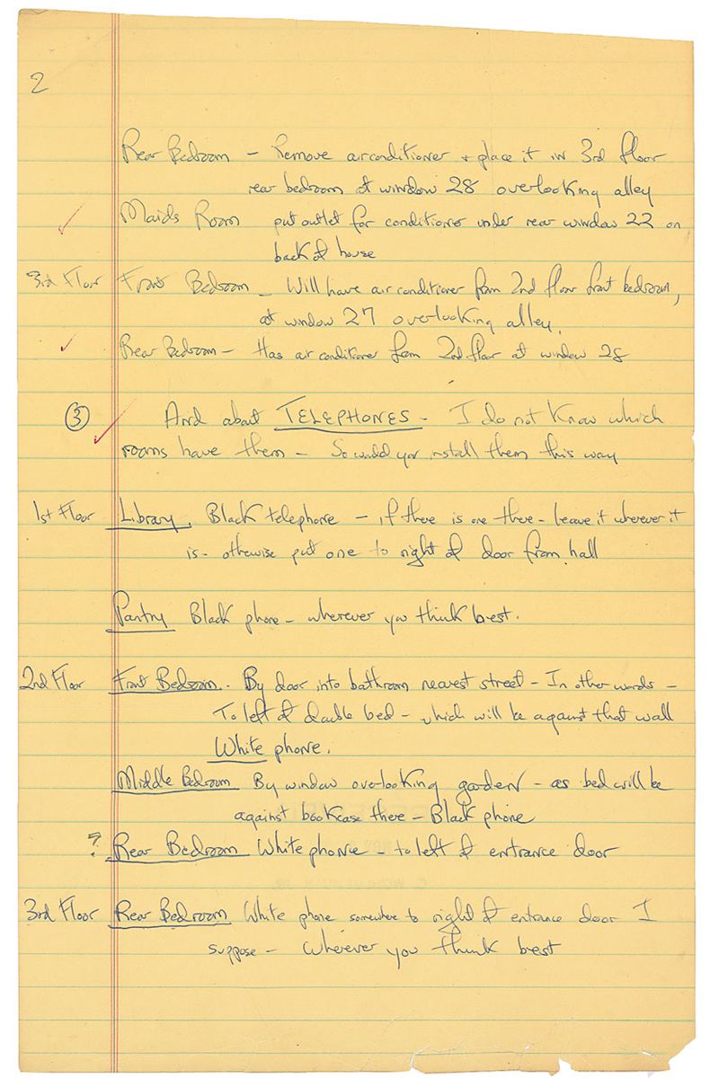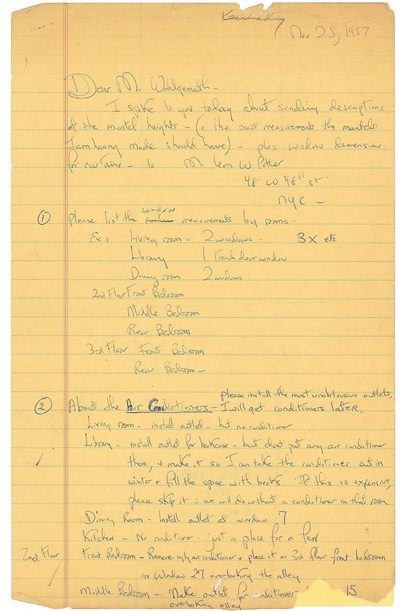 ALS signed “Jacqueline B. Kennedy,” four pages, lightly-lined, 8 x 12.5, November 25, 1957. Letter to M. Wohlgemuth regarding the design and decoration of their Washington home. In part: “I spoke to you today about sending descriptions of the mantel heights—(& the exact measurements the mantels I am having made should have)—plus window dimensions for curtains…2. About the Air Conditioners—please install the most unobtrusive outlets, I will get conditioners later. Living room—install outlet—but no conditioner. Library—install outlet for bookcase—but don't put any air conditioner there, & make it so I can take the conditioner out in winter & fill the space with books. If this is expensive, please skip it—we will do without a conditioner in that room…About where to install Light Fixtures in Dining Room Please install them opposite the windows, as we discussed—But be sure you center them on that wall —i.e. find the center of the wall & place them equidistant from it—roughly opposite the windows.”