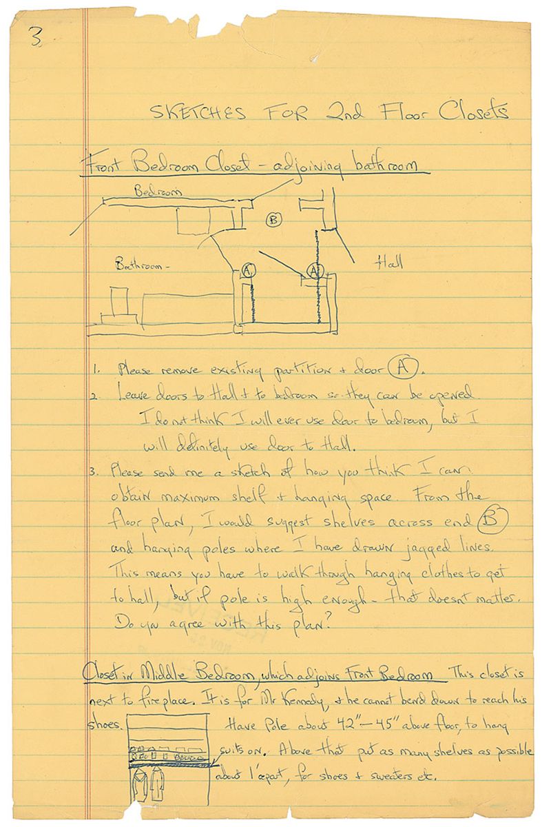 Kennedy’s lengthy postscript extends onto the fourth page, and includes two original sketches, one titled “Front Bedroom Closet—adjoining bathroom,” with Kennedy adding underneath, “Send me a Sketch of how you think I can obtain maximum shelf & hanging space. From the floor plan, I would suggest shelves across end B and hanging poles where I have drawn jagged lines. This means you have to walk through hanging clothes to get to hall, but if pole is high enough - that doesn‘t matter. Do you agree with this plan?” At the bottom of the last page, she adds another sketch headed “Closet in Middle Bedroom,” adding “This closet is next to fireplace. It is for Mr. Kennedy, he cannot bend down to reach his shoes.” In very good condition, with a central horizontal fold to all pages, scattered creases and wrinkles, paper loss and tears to edges, staple holes to top left, and some toning to first page. An excellent example of Kennedy’s flair for design and attention to every detail, especially those concerning her husband.