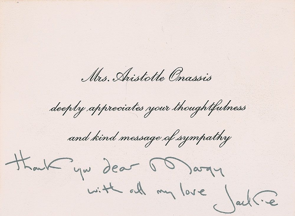 ANS signed “Jackie,” one page, 5.25 x 3.75, no date. Short note to the wife of Robert McNamara beneath a pre-printed message which reads, “Mrs. Aristotle Onassis deeply appreciates your thoughtfulness and kind message of sympathy,” Jackie writes, “Thank you dear Margy with all my love.” In fine condition. Letter originates from the Estate of Robert S. McNamara.