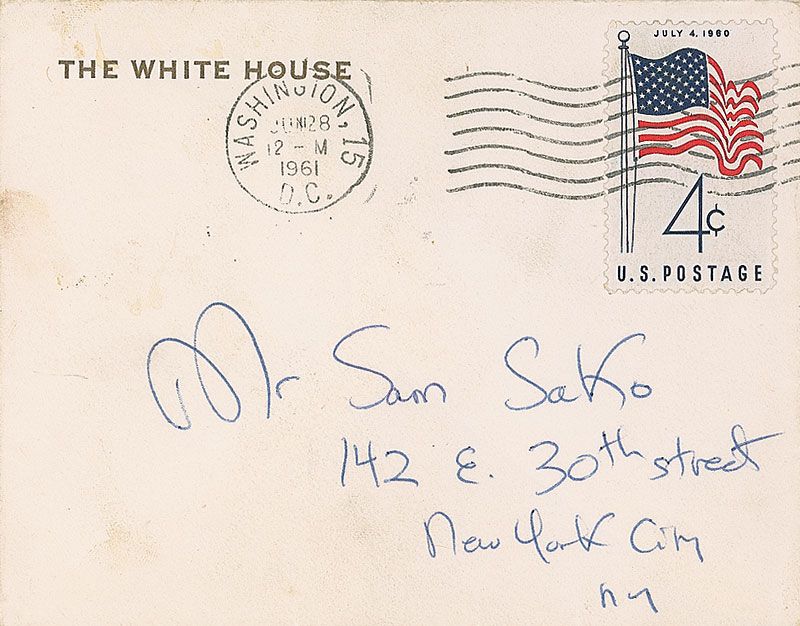 Two other one-page letters order photos from Sako, one reading in part: “About 5 x 7 twice as big as the little ones you sent last time—You keep these big contact pages.” The final letter, on a White House note card sends Christmas wishes. Two are accompanied by their original transmittal envelopes. In fine condition, with a bit of scattered light toning and soiling.
